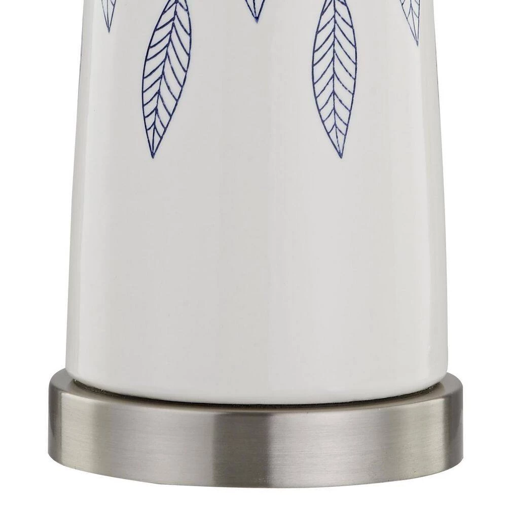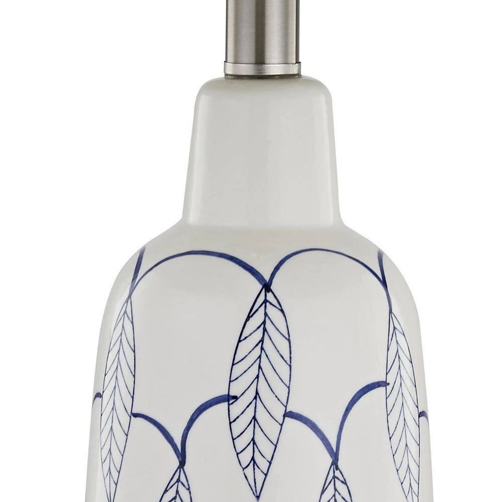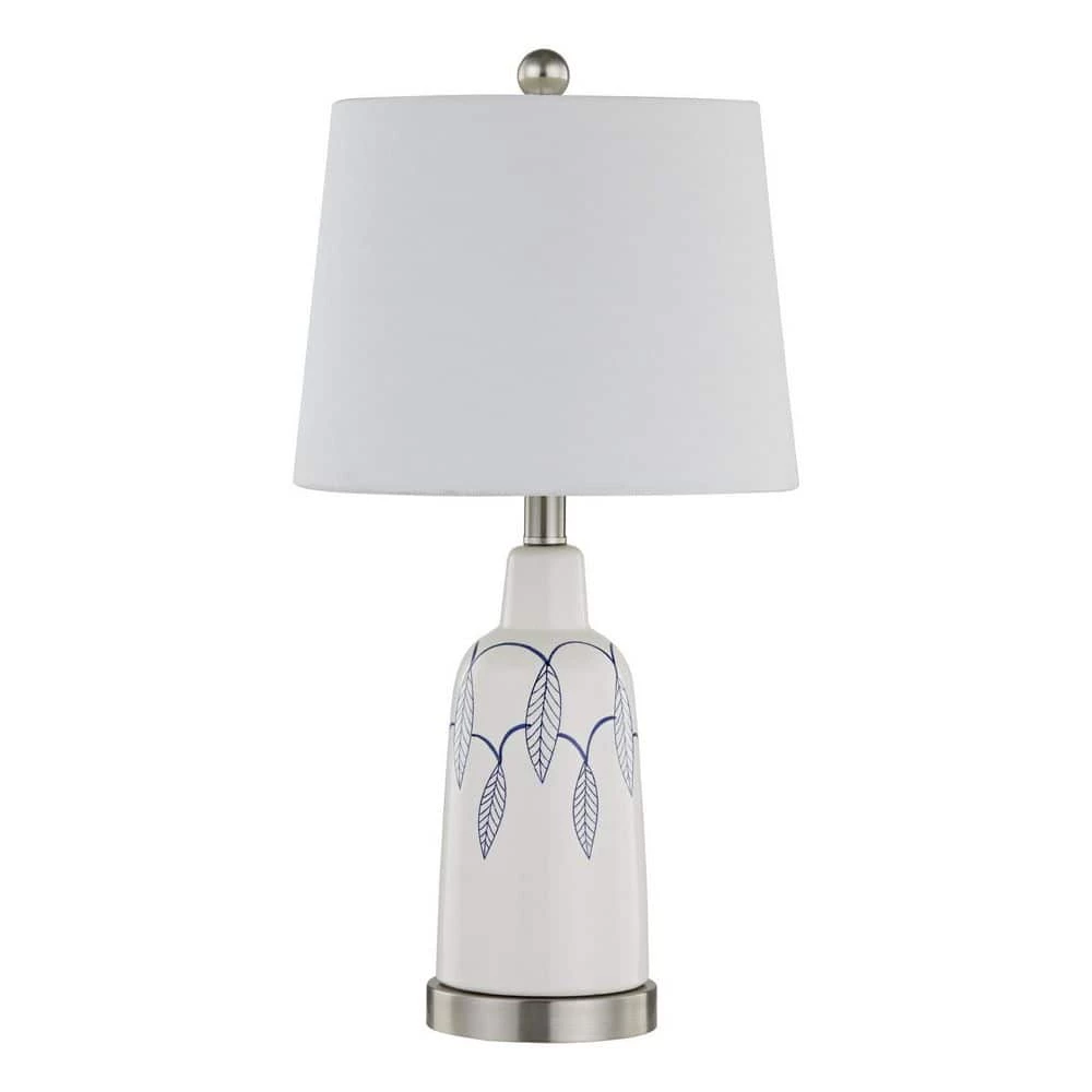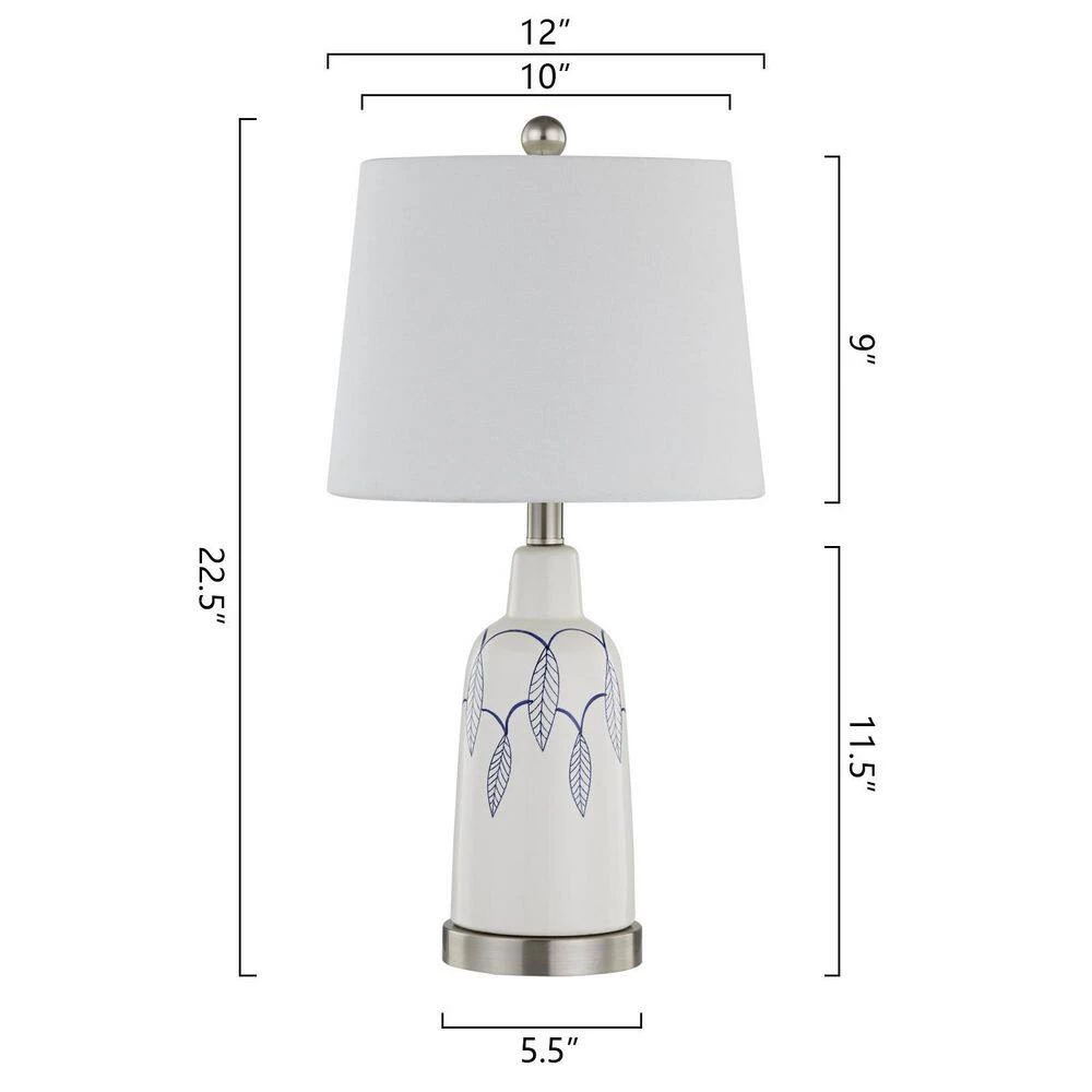 This 2-piece set of table lamps features a clean, classic design accented with painted feather details. Each lamp is made from porcelain in a classic white finish that’s accented with hand-painted blue feather designs held together by arched lines that resemble a garland or string lights. They’re topped off with white linen drum-shaped shades and a sleek silver finial that matches the hardware. Each lamp accommodates a single 100-Watt bulb and stands 22.5 in. tall.