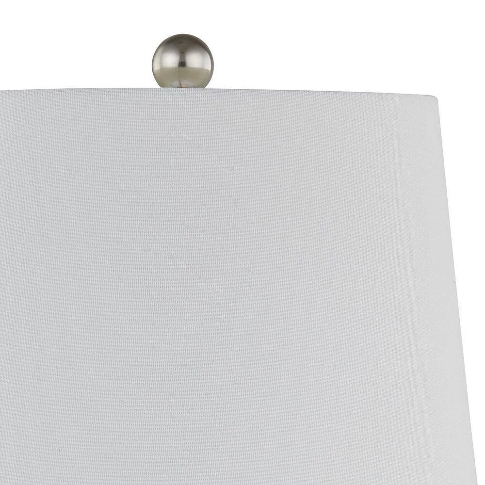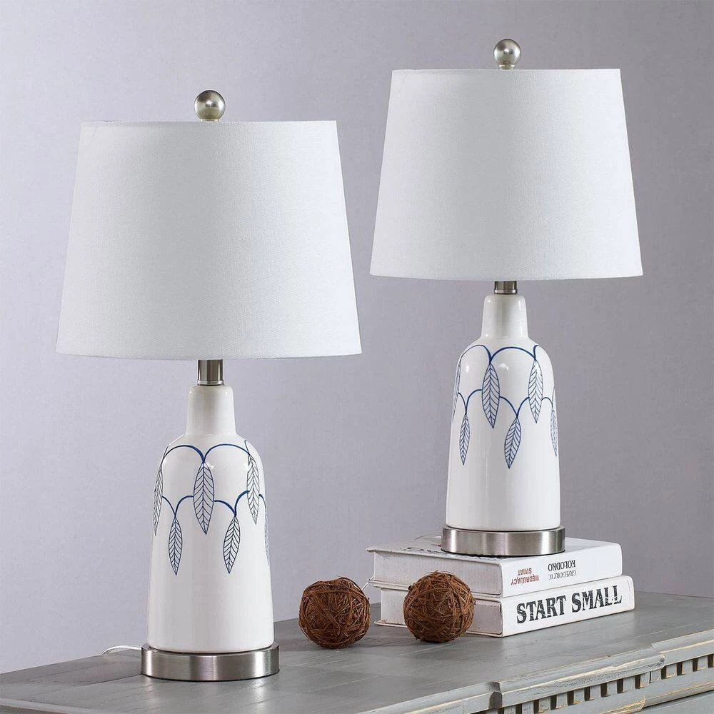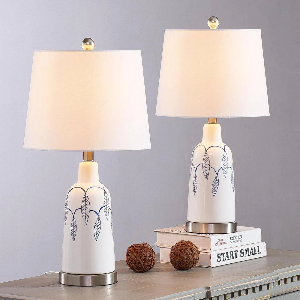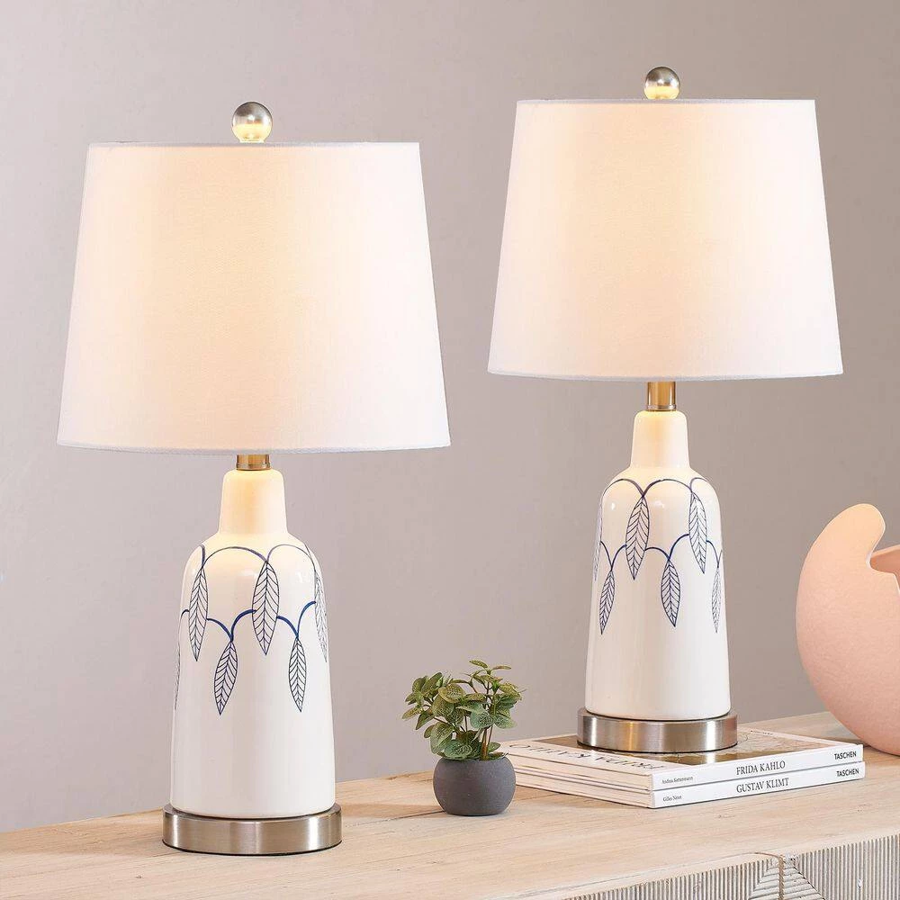 This 2-piece set of table lamps features a clean, classic design accented with painted feather details. Each lamp is made from porcelain in a classic white finish that’s accented with hand-painted blue feather designs held together by arched lines that resemble a garland or string lights. They’re topped off with white linen drum-shaped shades and a sleek silver finial that matches the hardware. Each lamp accommodates a single 100-Watt bulb and stands 22.5 in. tall.