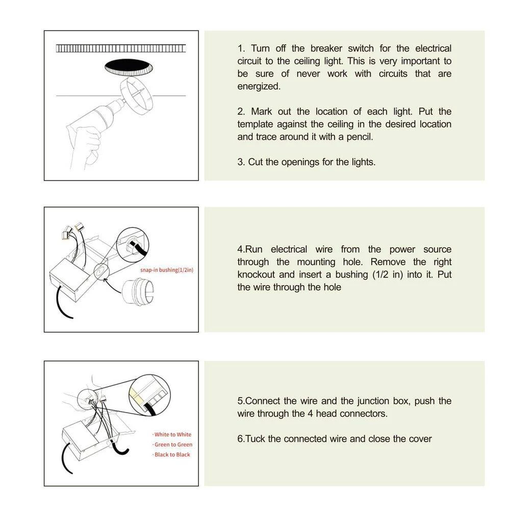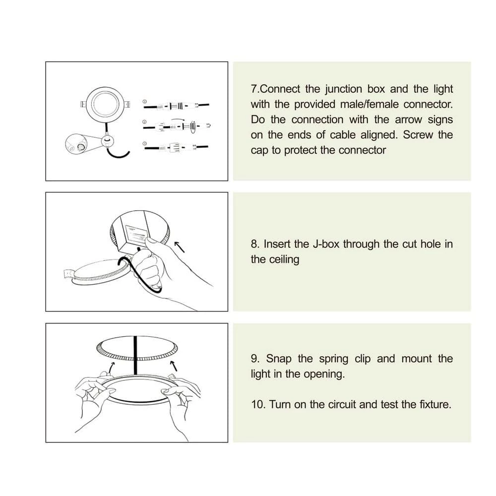 - Easy installation: hassle-free, the installation can be done in seconds, no housing is needed, cut a hole in your ceiling with a 1:1 paperboard, connect the J-box to the cables, and use the spring clip to mount it on the top