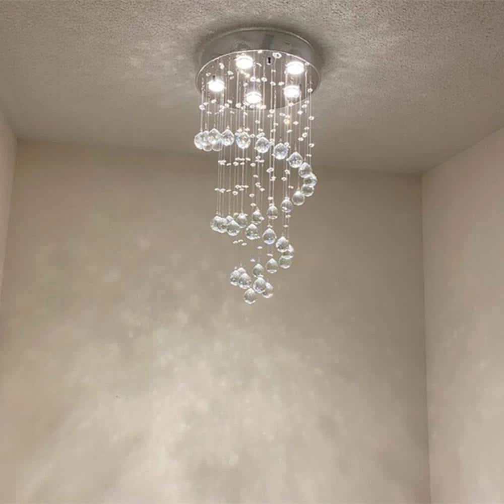 This fixture features 5 lights with sparkling spiral 100% crystal balls that give beautiful rainbow lights everywhere in the room. Attaching string and drops are very easy. Install a dimmer switch for a warm glow effect and easily change the look and feel of the room.