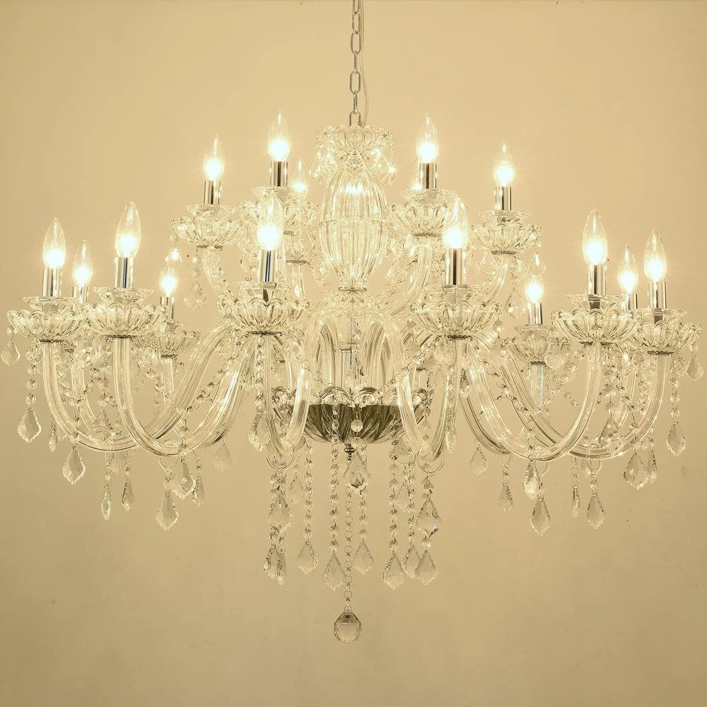 This gorgeous crystal chandelier with 18 glass arms features a candle-like design for a traditional European look. This chandelier sparkles and spreads light throughout your room with the crystal designs and crystal tube arms to amplify the reflective quality. The luxurious and beautiful crystal chandelier is worthy of your possession.