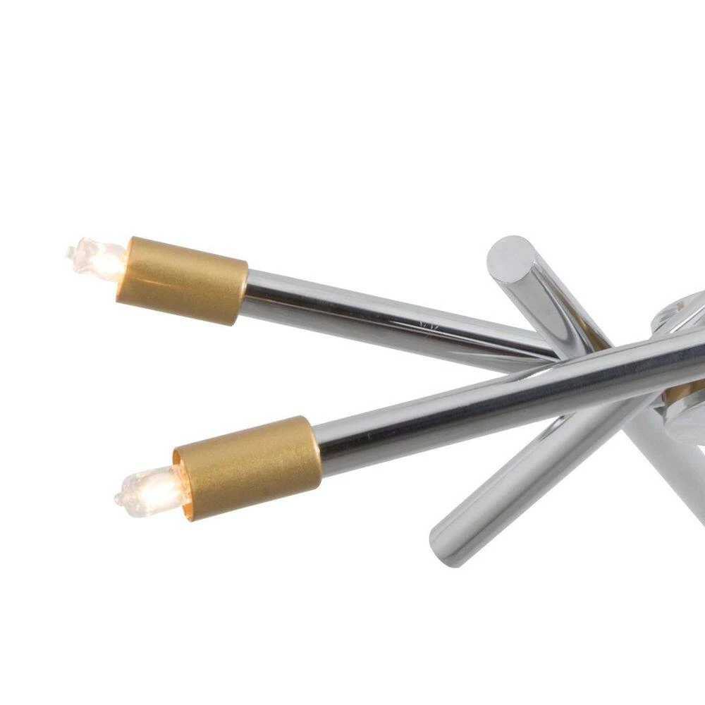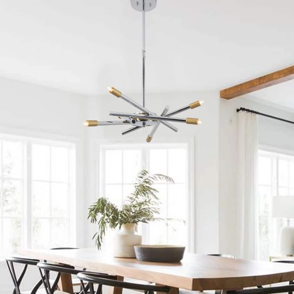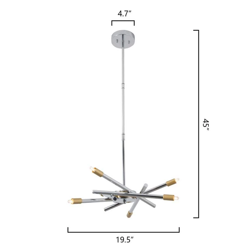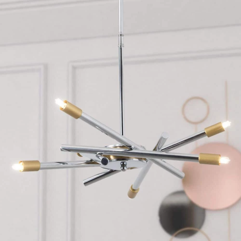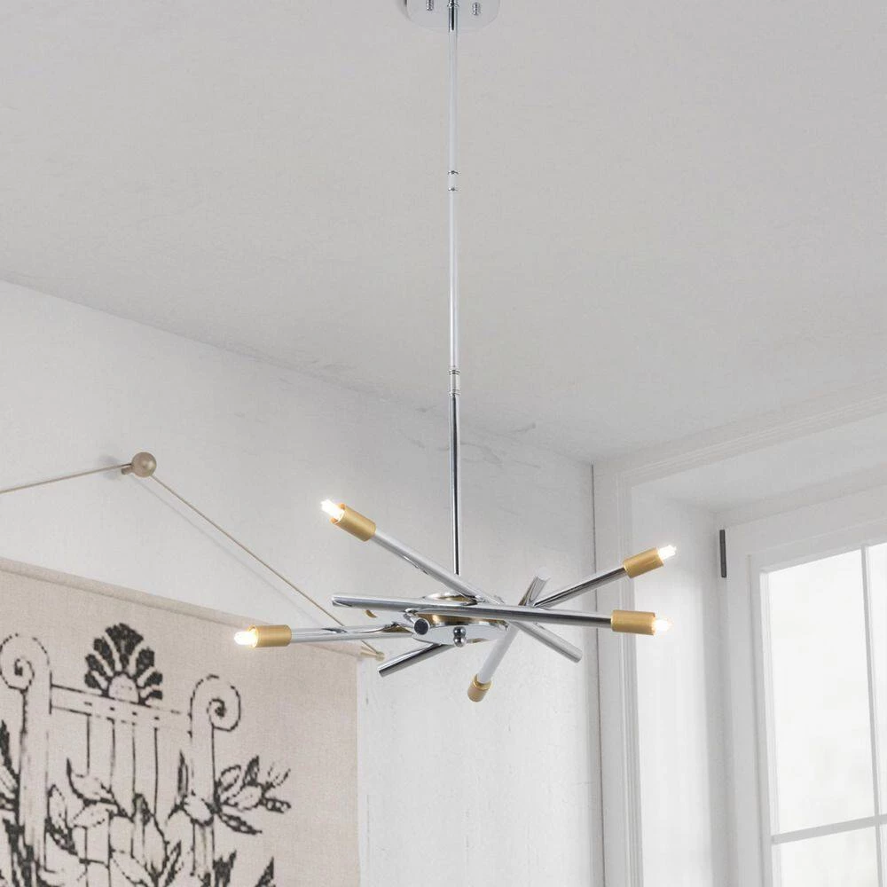 This 6-light Sputnik-style chandelier boasts mid-century-inspired details and modern style. Crafted from wrought iron, this chandelier showcases a chrome finish with luminous brass accents for a luminous touch. A central rod balances 6 arms that branch out in different directions that create a dynamic shape. Each rod ends in a 60W standard size bulb socket (bulbs sold separately). A height-adjustable download lets you select the right position for your space, and its circular canopy works with sloped ceilings. Pair it with a dimmer switch for customized lighting in your entryway or living room.