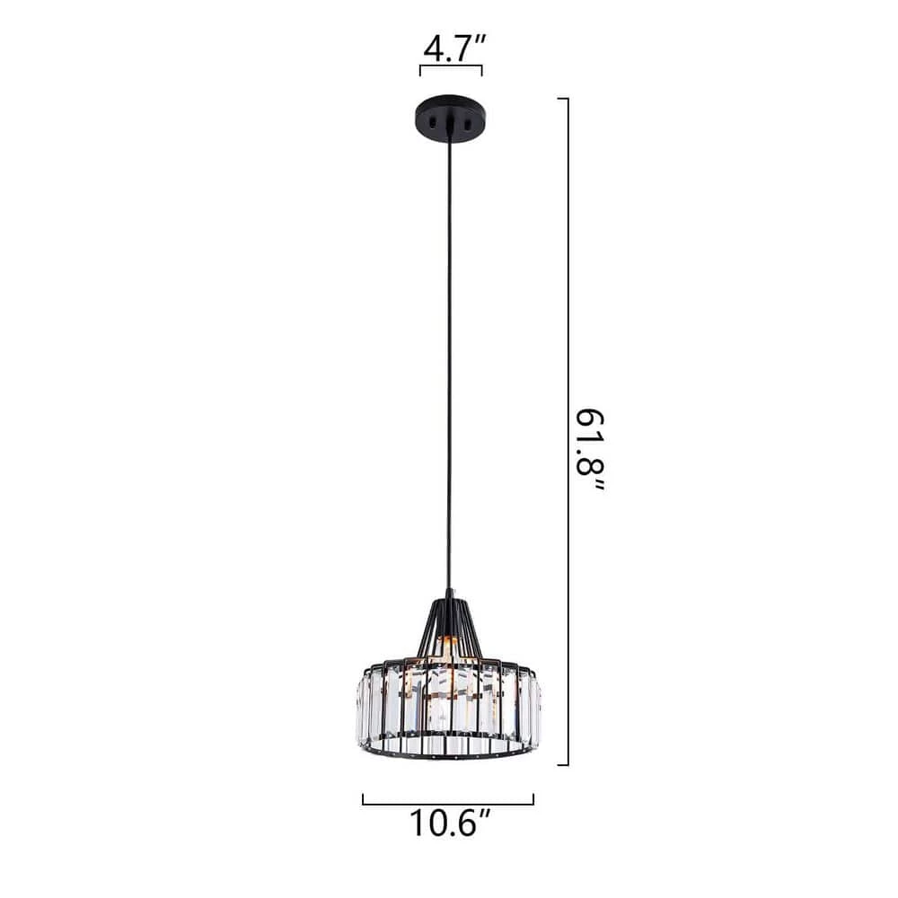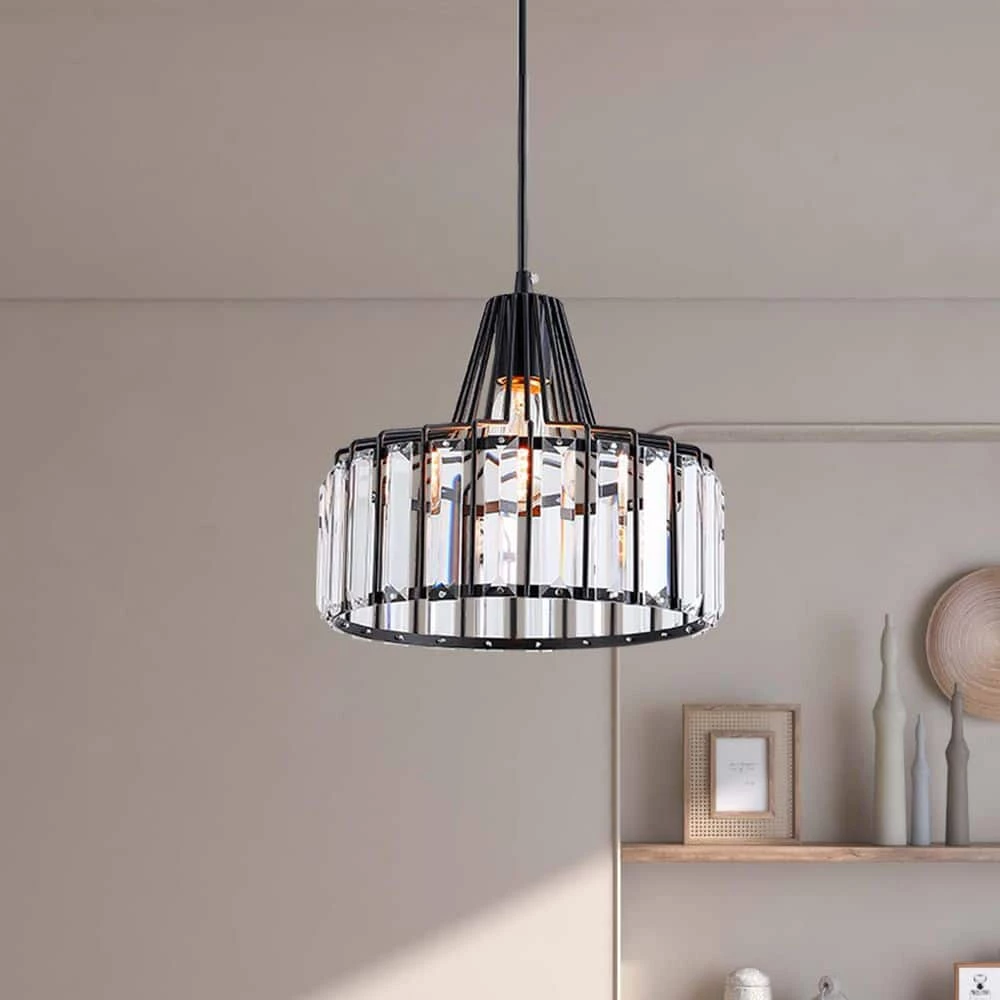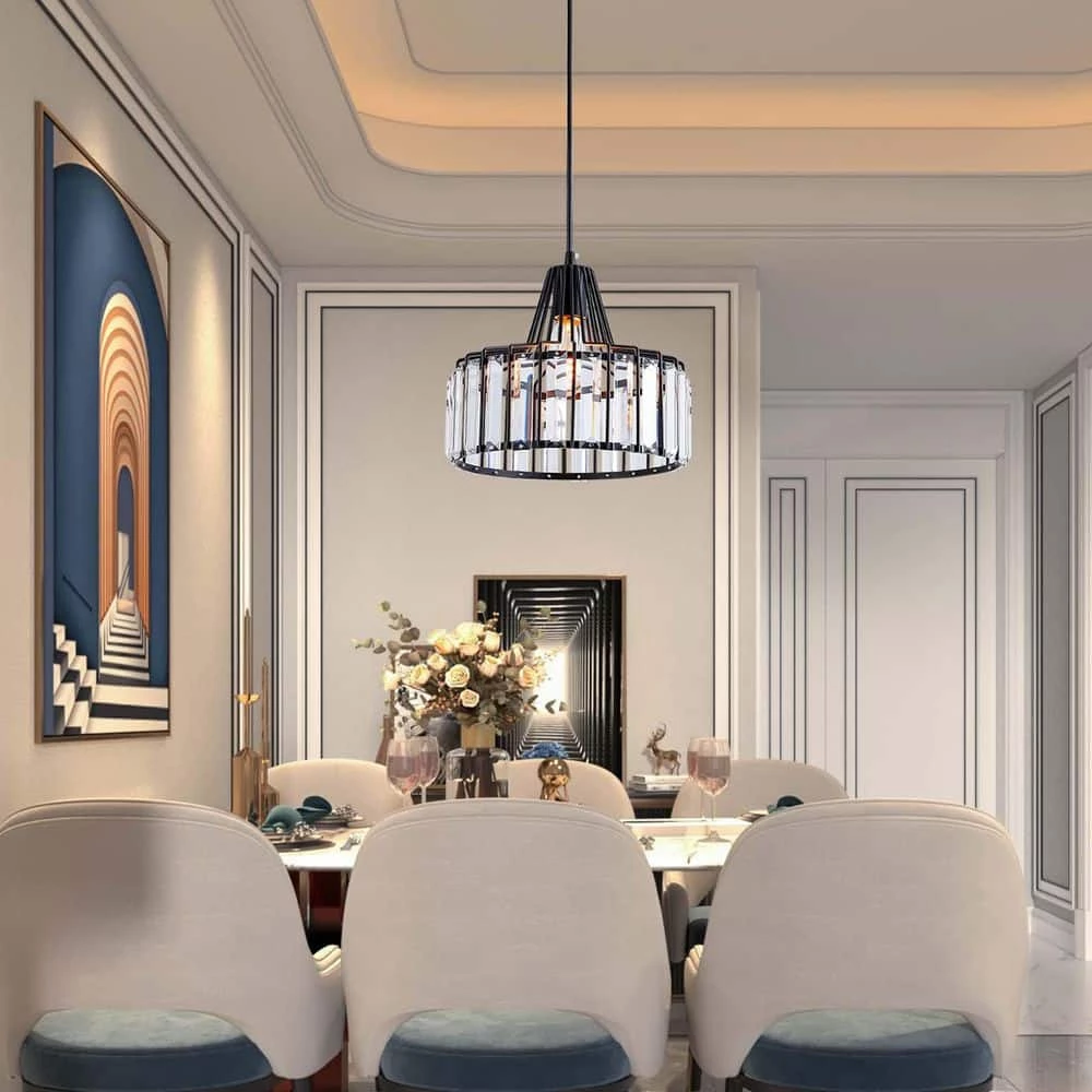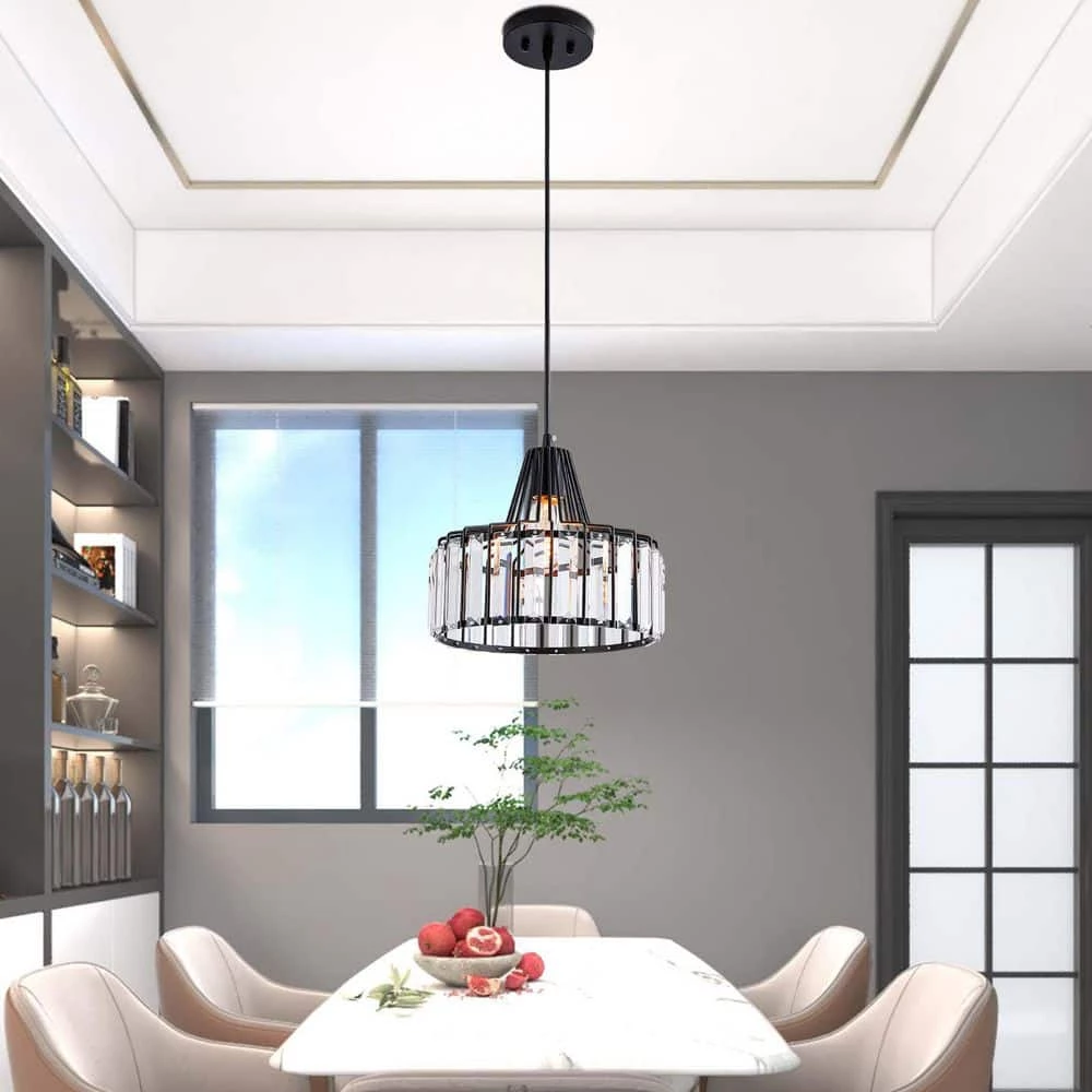 This 1-light drum pendant illuminates your space with ambient light and an ultra-modern vibe. We love the crystal accents that add sparkle to this fixture and reflects the light around your space in an artful way. The round canopy, height-adjustable downrod and body are made from wrought iron in a black matte hue. The teardrop shaped shade houses a standard bulb (sold separately) and this light is sloped ceiling compatible opening up versatile options for placement. It also works with dimmer switches, allowing you to easily change the look and feel of the room. This pendant light comes with a 1-year manufacturer’s warranty.