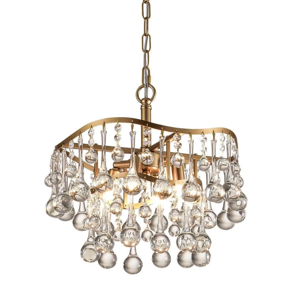 This height-adjustable, 4-light chandelier makes a glamorous statement in your living space. It features a round canopy, chain downrod, and 4-tiers, all made of metal in a gleaming glitter gold hue. Clear crystals in various elongated shapes dangle from the tiers and catch and reflect the light in an artful way around the room. The 4 bulbs (sold separately) are visible through the crystals. We love that this chandelier is dimmer switch compatible, which allows you to adjust the brightness of the glow. What’s more, it is sloped ceiling adaptable, so you have versatile options for placement.