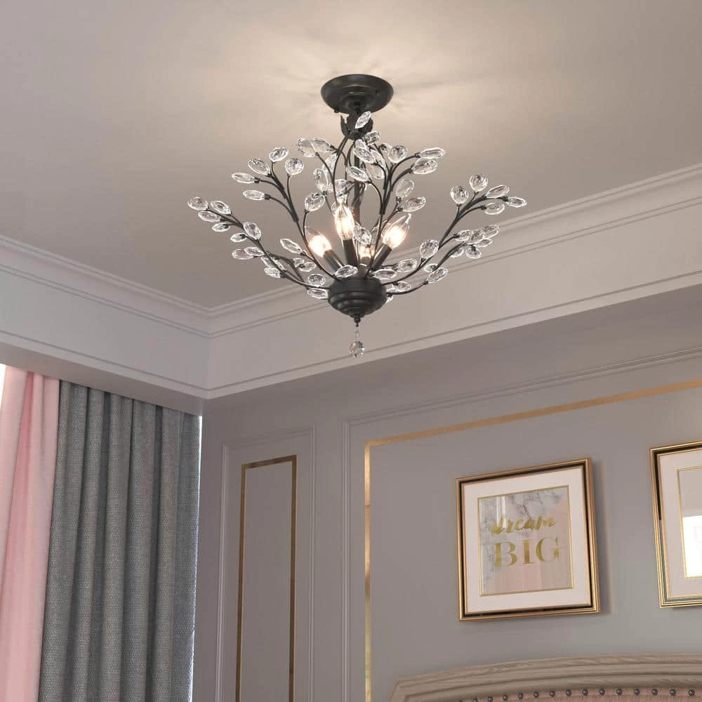 Add a contemporary and sense of creativity to your home. This lighting fixtures hard iron branches in a crystal leaves, it gracefully refracts light from the 4 candelabra bulbs for enchanting beauty. The combination of black metal and crystal clear crystals is more modern and beautiful.