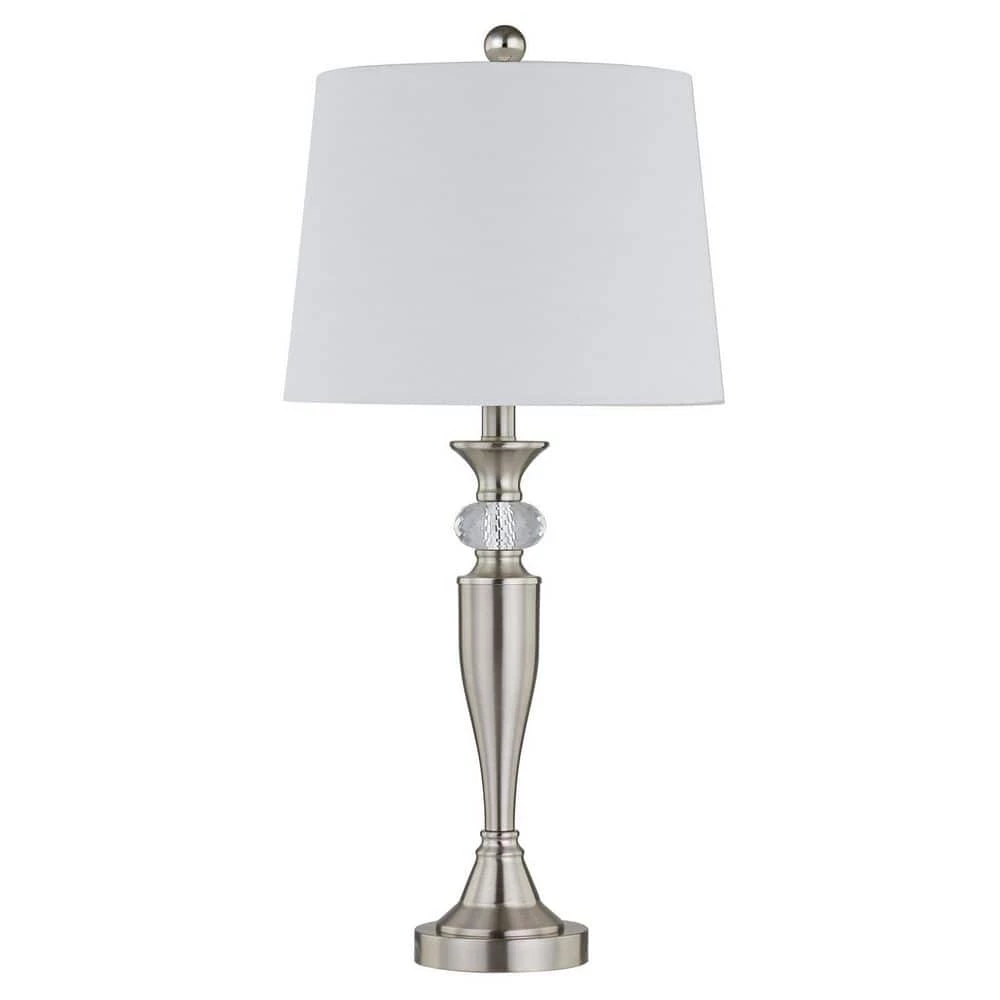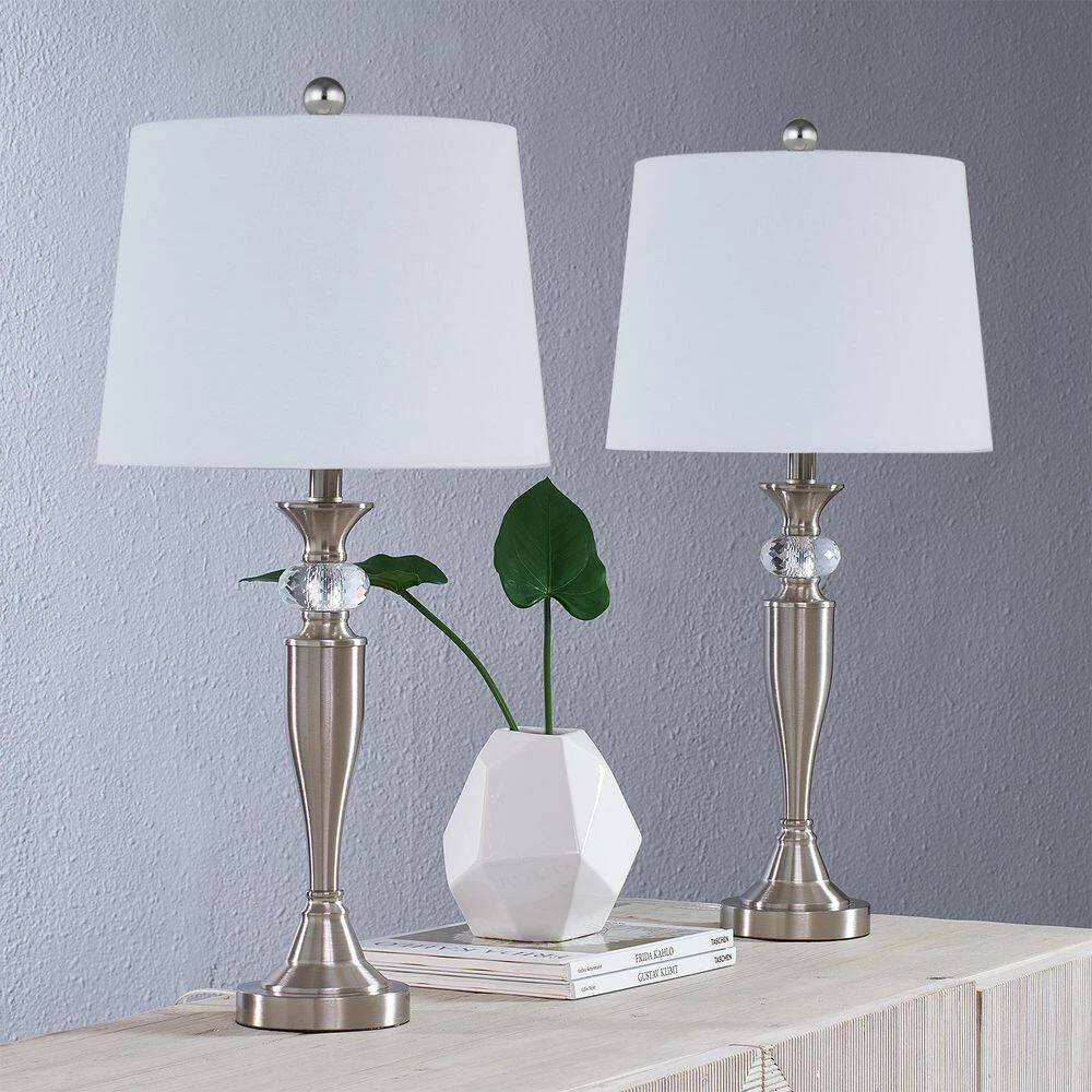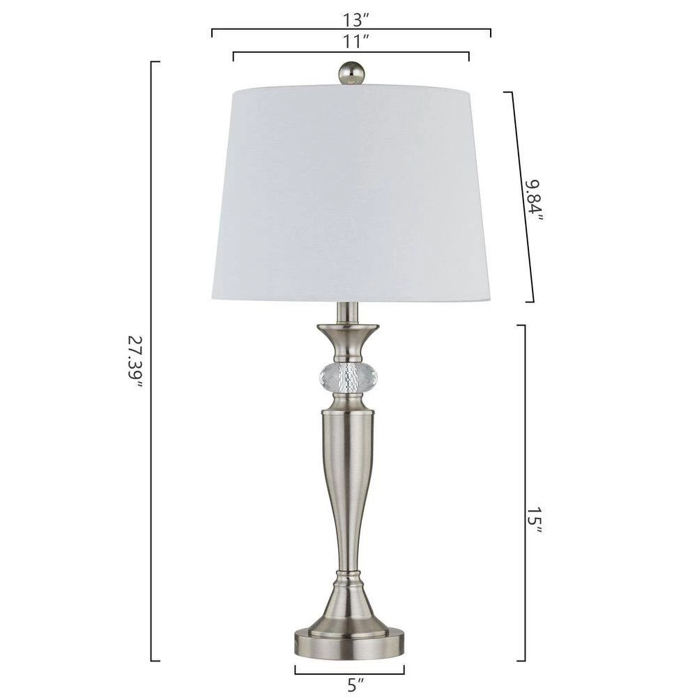 Add sleek modern style to your living space with this pair of table lamps. The base is made from metal in a nickel finish and has an eye-catching hourglass shape. We love the crystal bulb at the base of the fixture that catches and reflects the light around your room in an artful way. The empire shade is made from 100% linen and a finial peaks out from the top. The 3-way switch allows you to determine the brightness of the light from the 100-Watt bulb, sold separately. This pair of table lamps complete the look of your bedroom or living room.