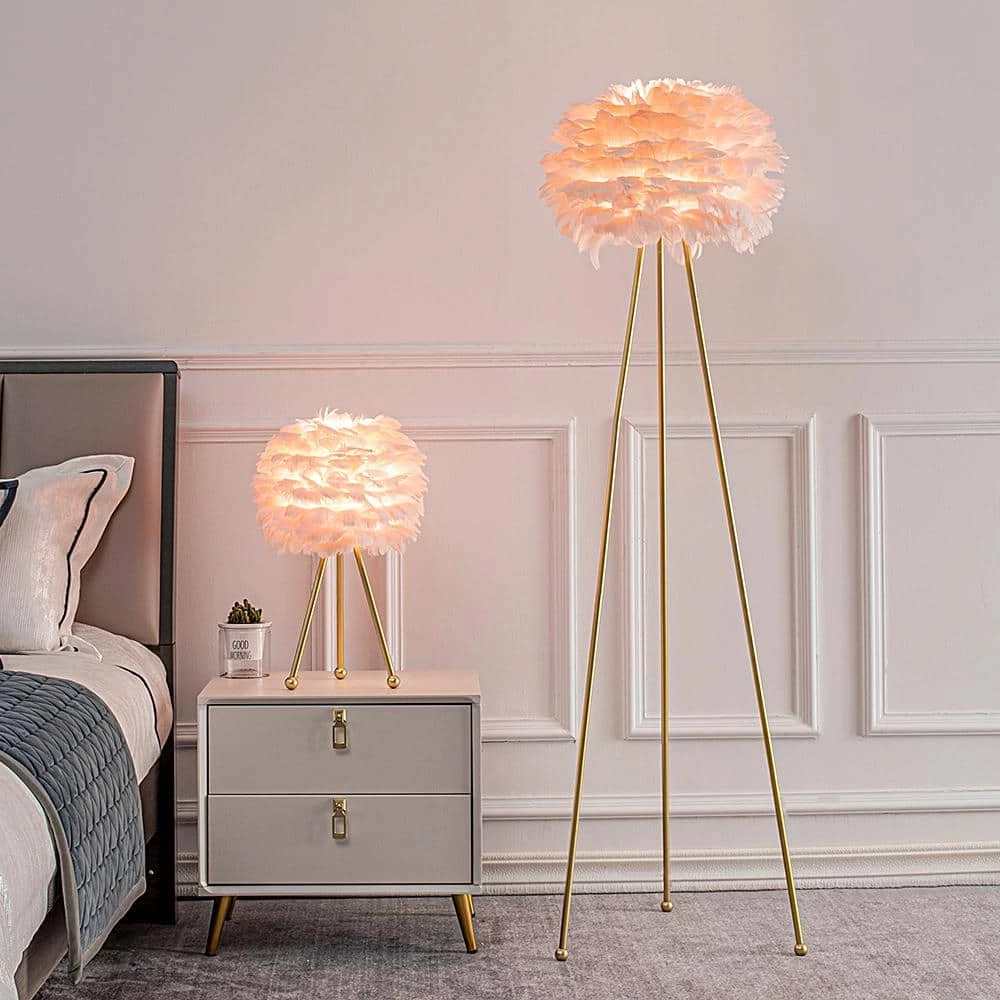 This floor lamp is very suitable for adding eye-catching highlights to any room that needs to be upgraded, and provides plenty of light for your entrance, bedroom or hall. The floor lamp body is made of feathers and metal, with a golden tripod and pink feather lampshade. Well-designed high-end high pole lights can add atmosphere to any room. No matter where you are, this unique set of high pole lights can add fashion to your place.