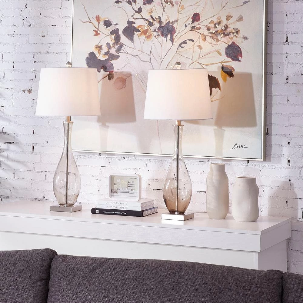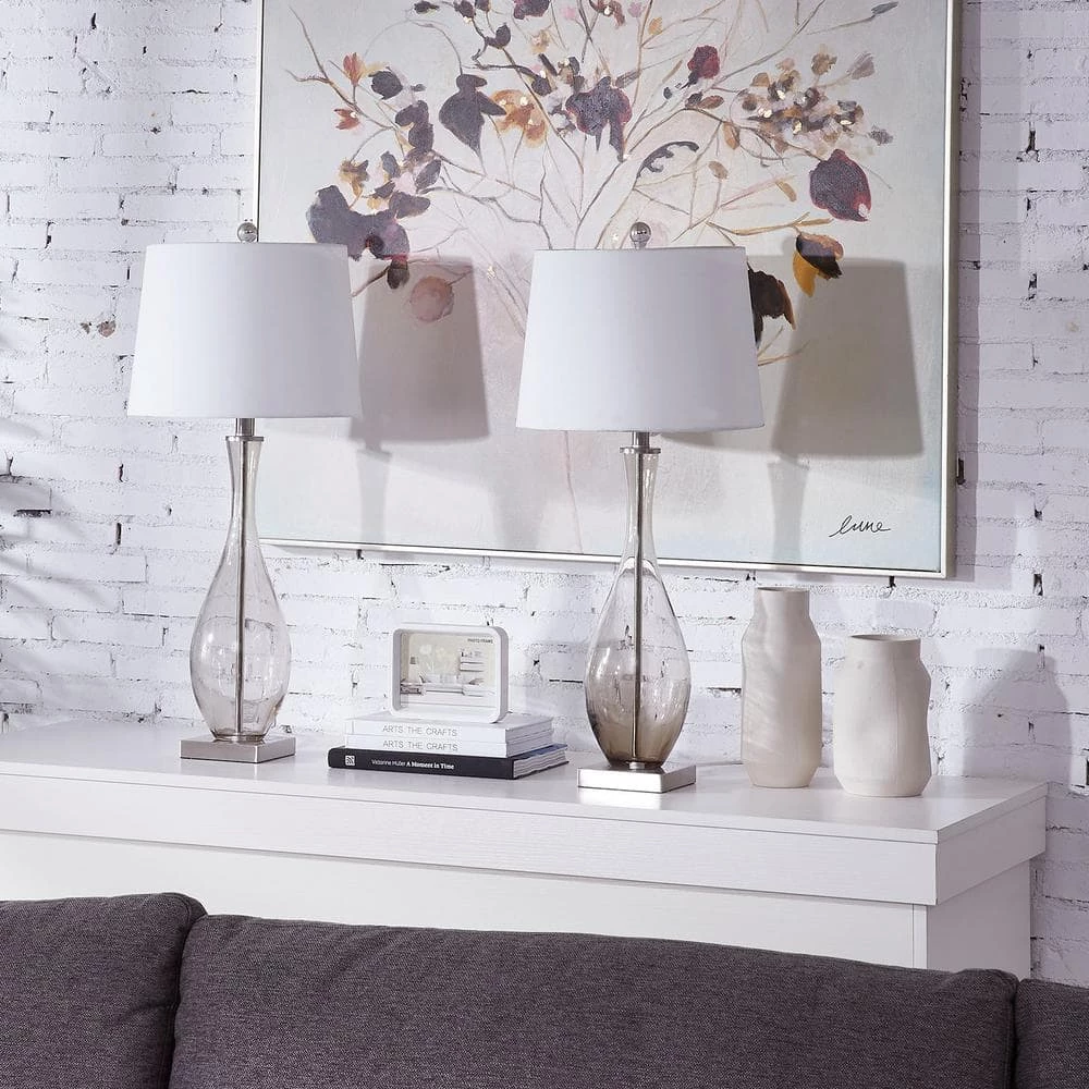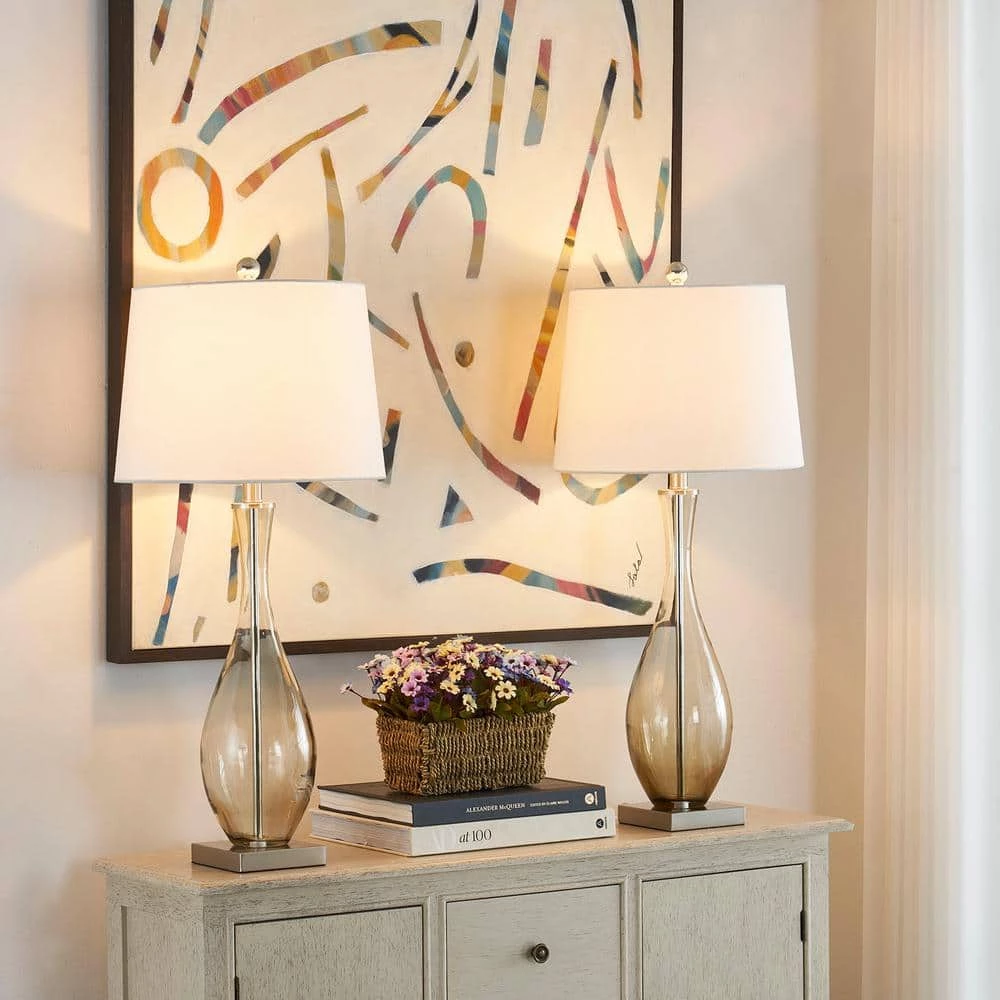 This set of 2-table lamps brings sleek coastal style to your living room, bedroom or home office. Each lamp is made of glass, with a rounded bottom and a slim neck; the square metal base features a brushed silver-tone, offering distinctive contrast. This light has an empire shade and a ball finial in clear glass. It features a 3-way rotary socket switch, so it’s easy to find just the right level of illumination and it accommodates a maximum 100-Watt standard bulb (not included). We love that each lamp has a built-in USB port, so you can keep your favorite devices charged.
