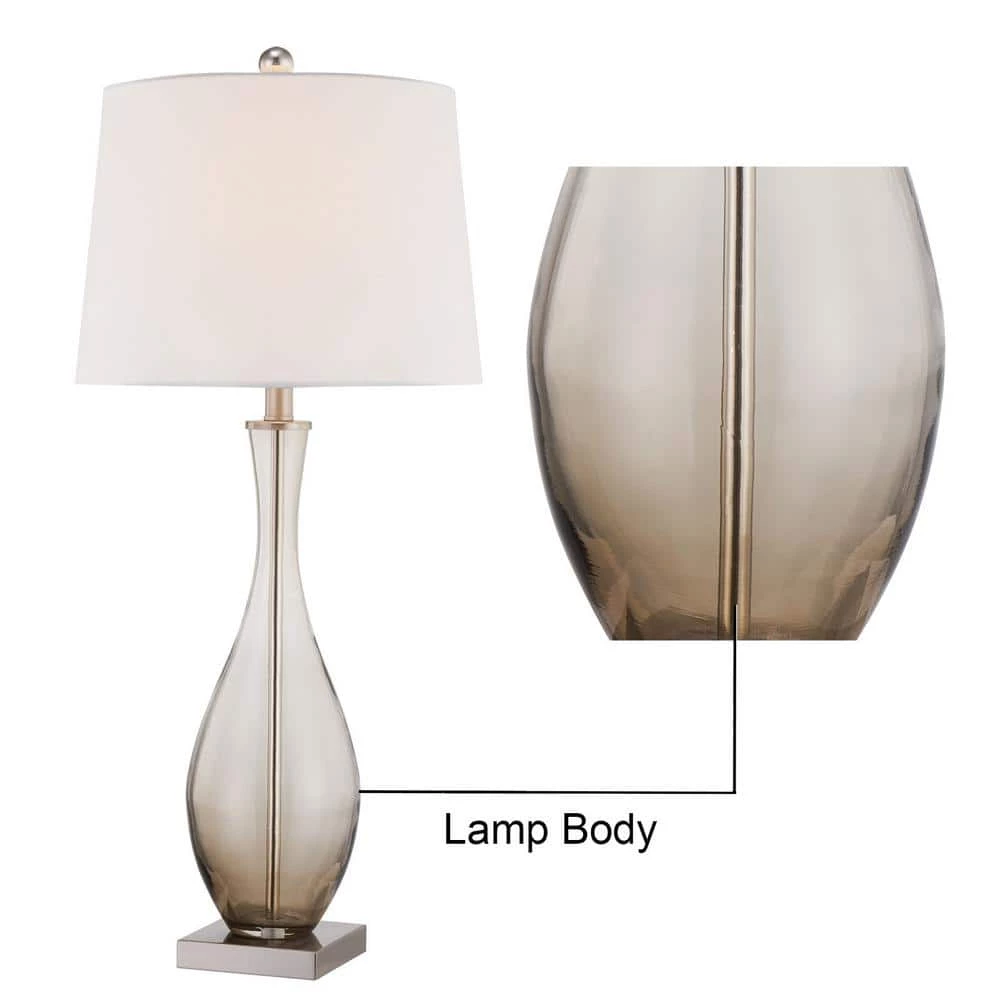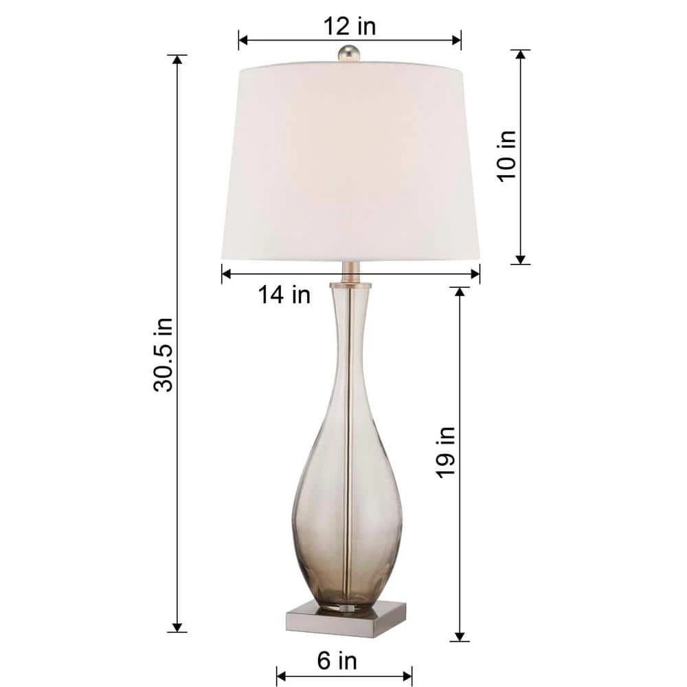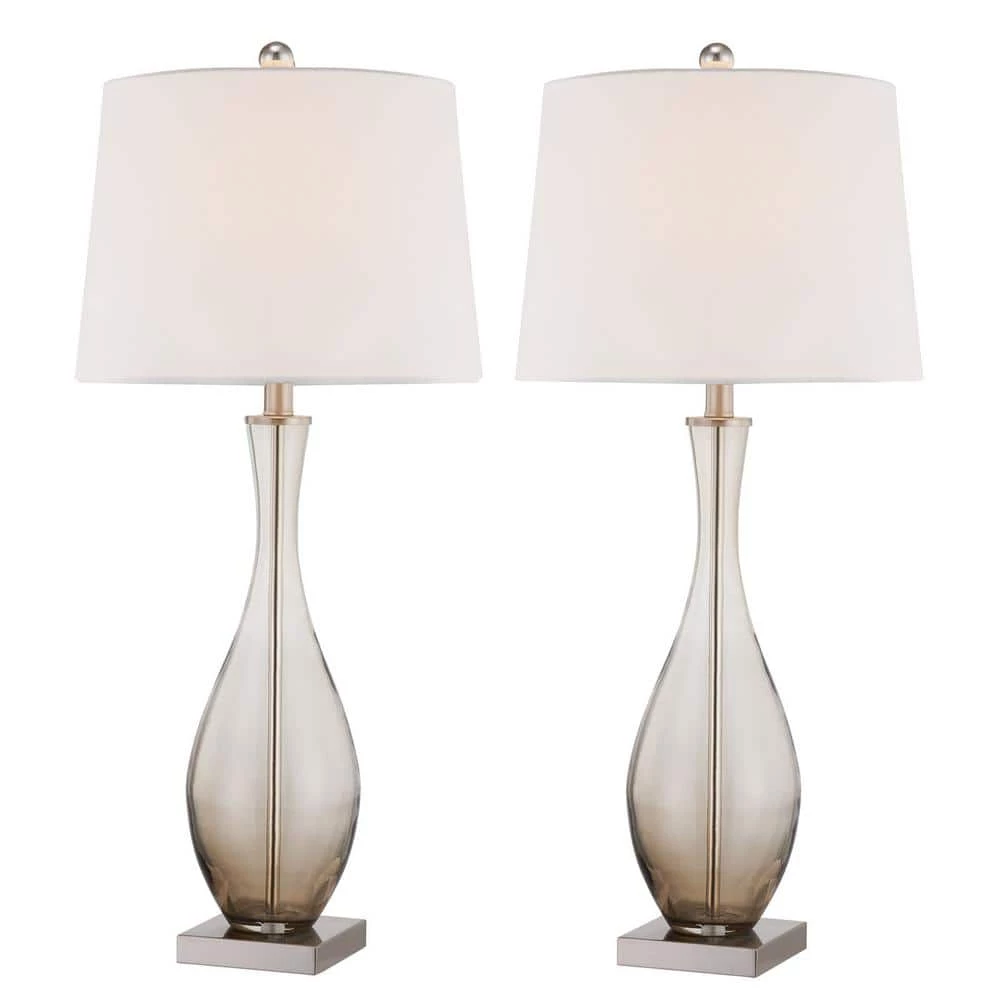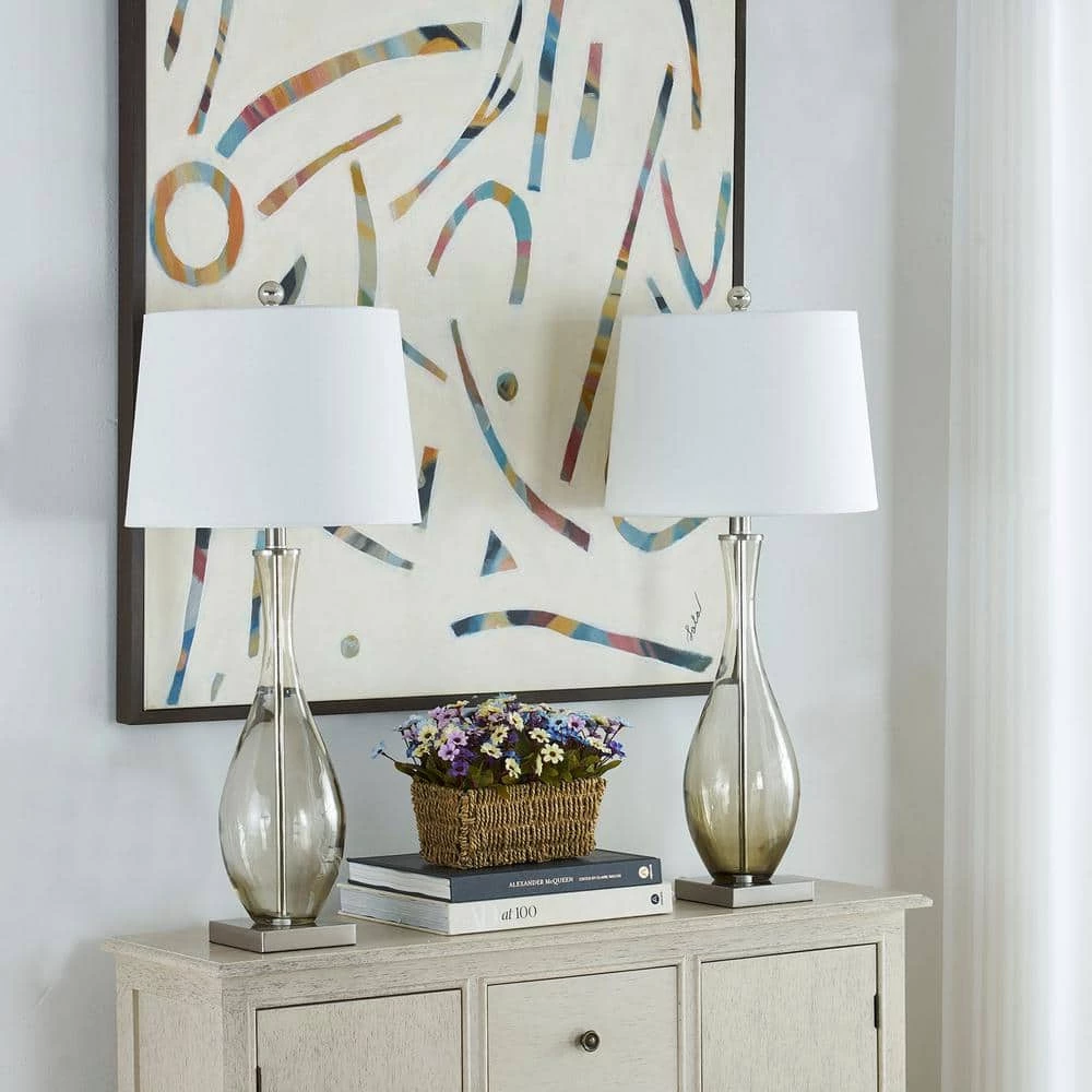 This set of 2-table lamps brings sleek coastal style to your living room, bedroom or home office. Each lamp is made of glass, with a rounded bottom and a slim neck; the square metal base features a brushed silver-tone, offering distinctive contrast. This light has an empire shade and a ball finial in clear glass. It features a 3-way rotary socket switch, so it’s easy to find just the right level of illumination and it accommodates a maximum 100-Watt standard bulb (not included). We love that each lamp has a built-in USB port, so you can keep your favorite devices charged.