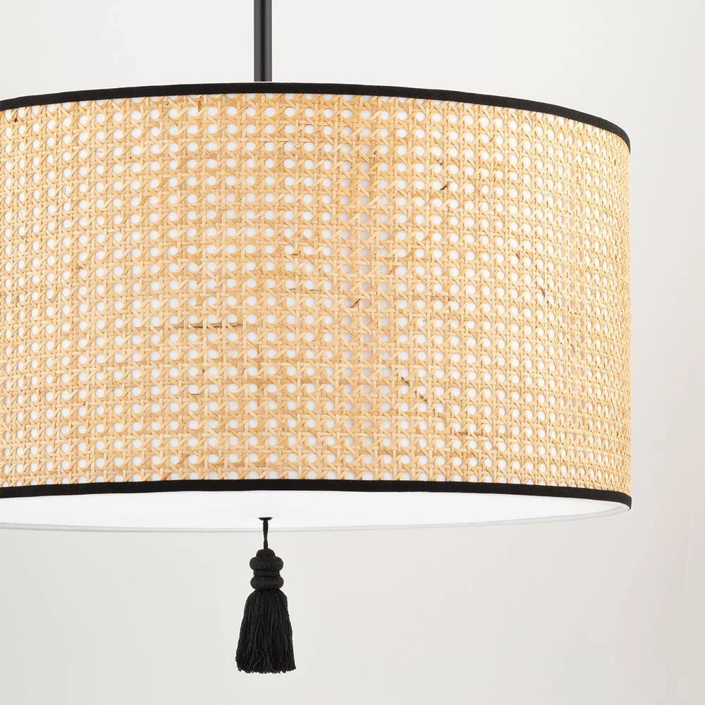 A bohemian darling, Dolores is brimming with theatrical flair. Dolores pays homage to the cane mania of the 70s, reinvented for today. Natural cane is woven intricately around a white cotton shade, contrasted with a soft black finish. The flush mount and pendant versions feature a decorative tassel for good measure.