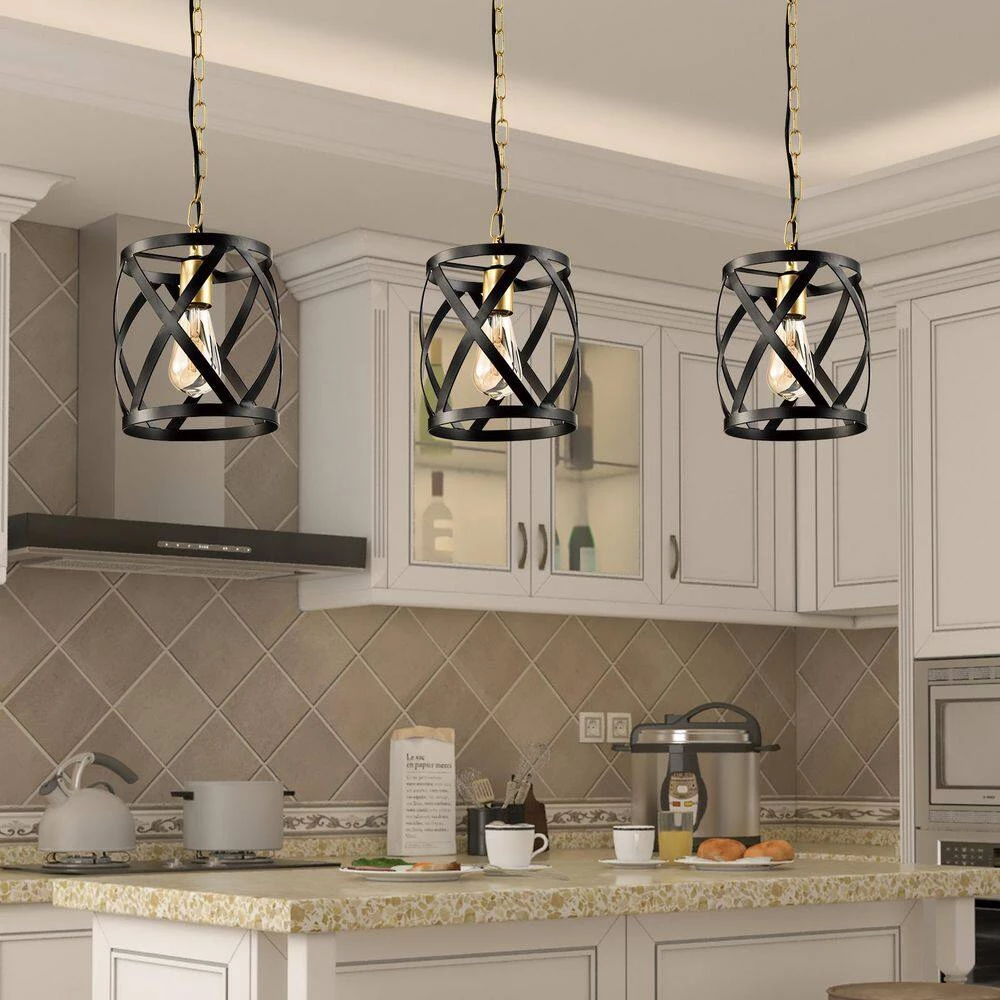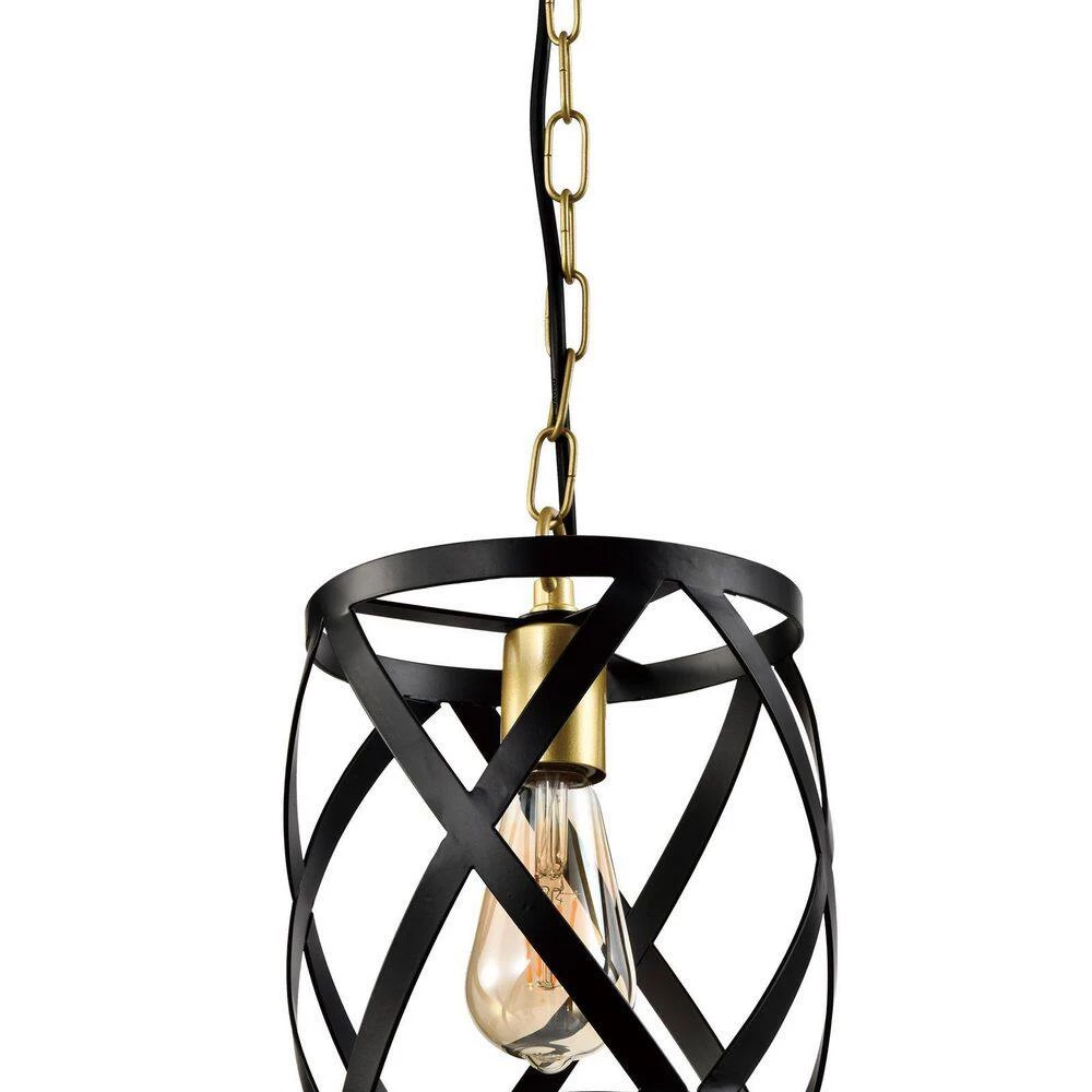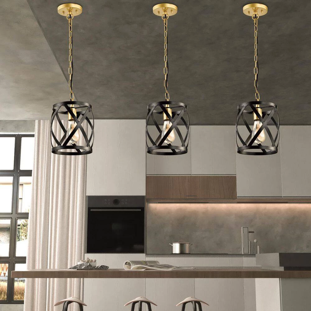 This 1-light cylinder pendant updates your space with plenty of light and industrial design. It has a gold-finished circular canopy with a height-adjustable downrod that ends in a single fixture. Surrounding the exposed-style bulb, the wrought iron open metal frame is painted a contrasting dramatic black. This mini pendant light measures 4.78 in. W, so pick up 1 for smaller spaces or multiple for larger rooms. Install it with a dimmer switch to control the level of brightness. We recommend completing the look with a filament bulb (sold separately).