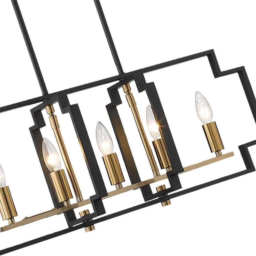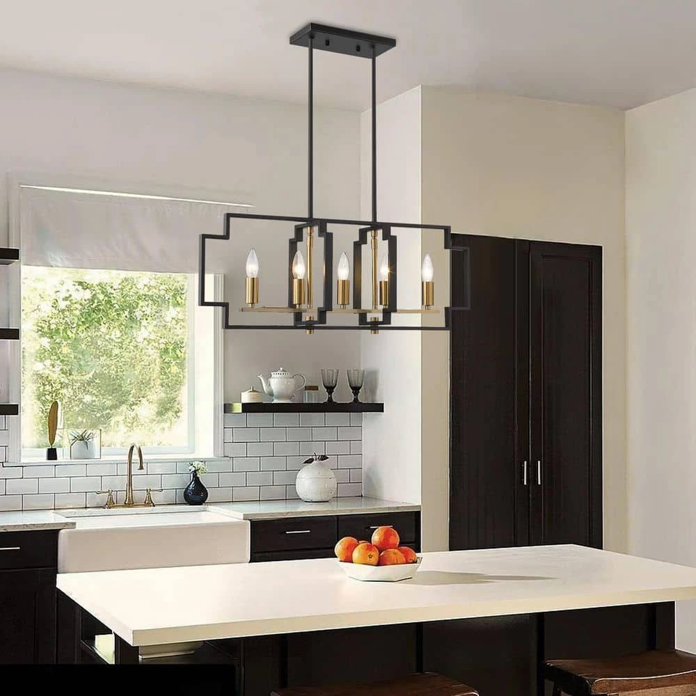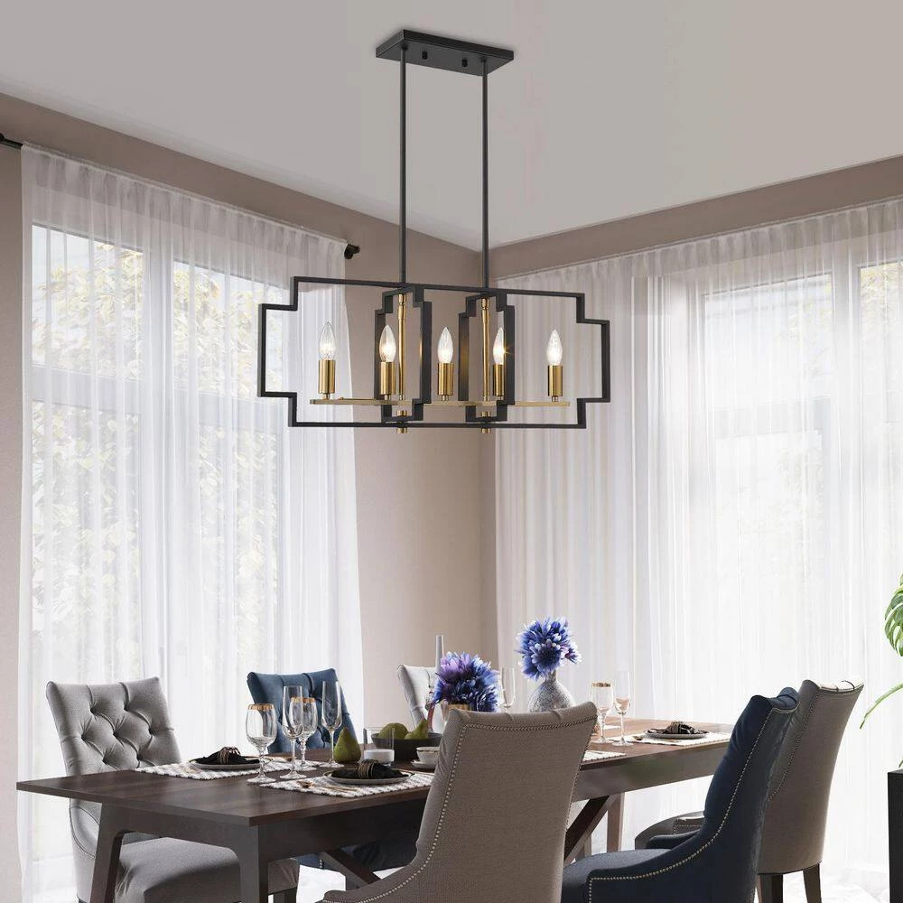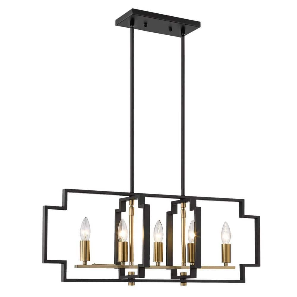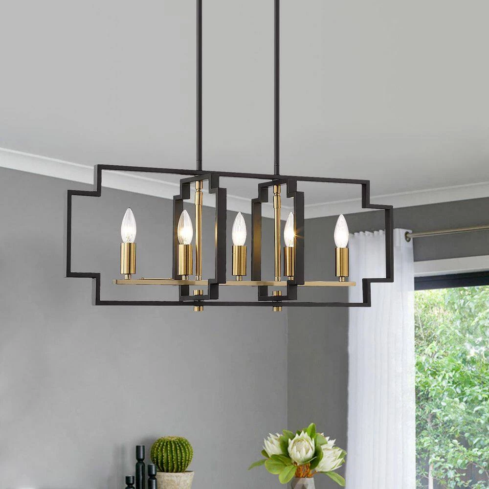 This 5-light lantern chandelier brings warm lighting and a modern, sculptural silhouette to your dining room or kitchen island. Made from wrought iron, its 5 candle-style fixtures are set inside a contrasting frame made by 3 open, intersecting rectangles with art deco-inspired inset corners. This fixture hangs from 2 height-adjustable downrods and a simple rectangular canopy. We love that it’s compatible with a dimmer switch, to let you set just the right mood in your space. Five 40-Watt bulbs are sold separately.