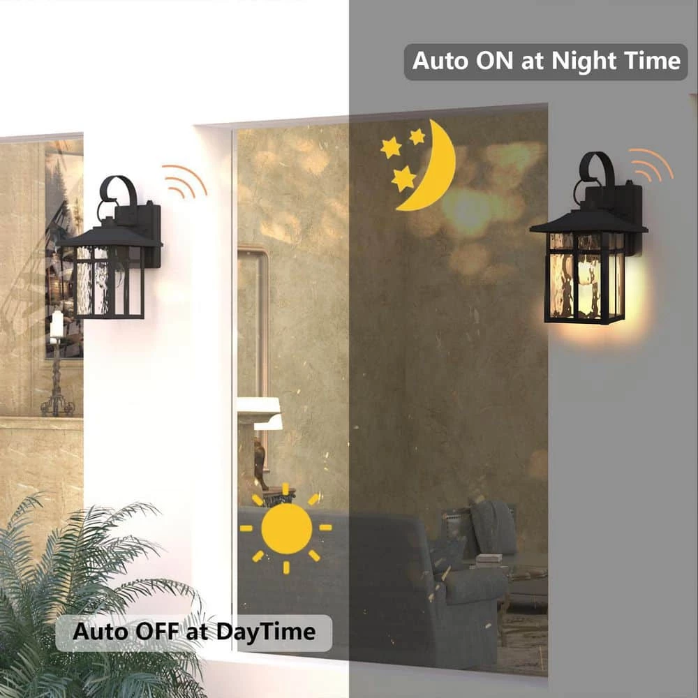 This weather-resistant outdoor wall lantern is presented in a square housing that evokes antique metalwork. while the seeded glass is framed by wire strips that give the appearance of windows, helping to create a warm, inviting ambience. Featuring dusk-to-dawn operation , this charming design adds style and safety at an entranceway, garage or other walled area.