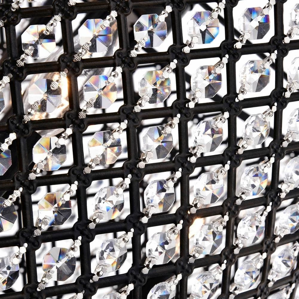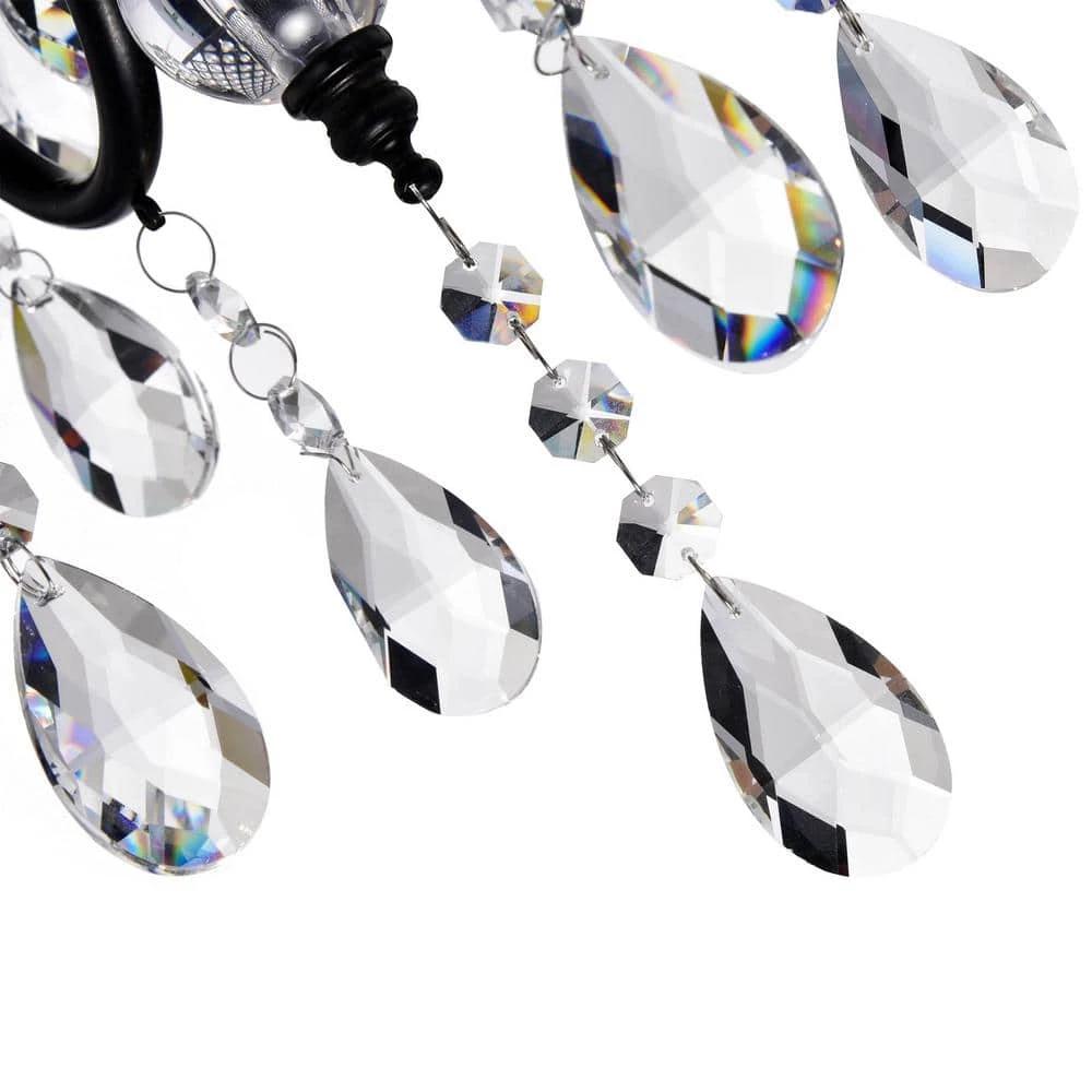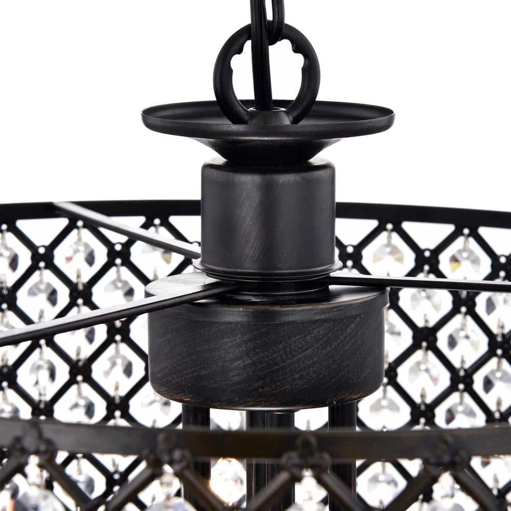 This unique elegant chandelier features black hardware in a crystal latticed drum shade. 2 layers of cascading crystals drip from the hardware that supports its 4 upward-facing bulbs. The chain can be shortened to adjust to your changing requirement.