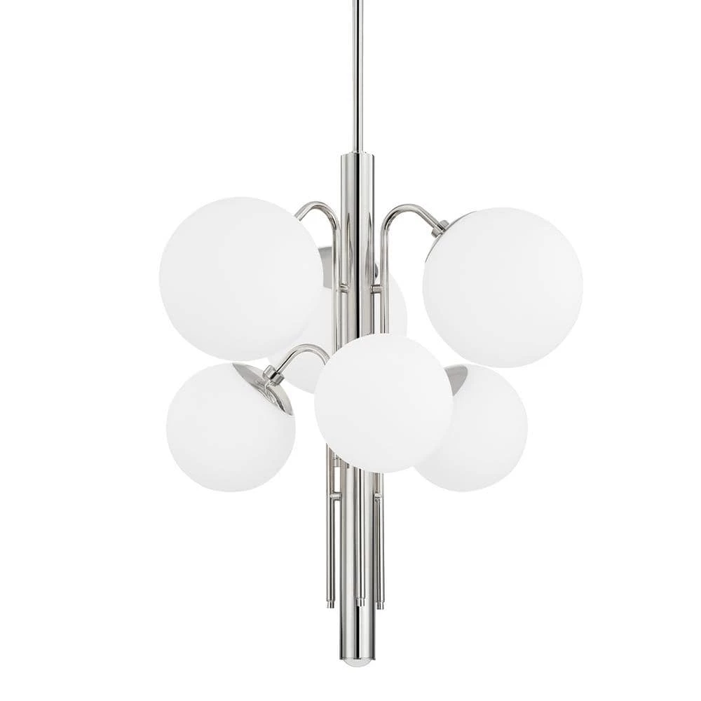 Ingrid is globe lighting with a literal twist. Large opal matte globes jut from the ends of just-barely-bent gooseneck arms to cast a wide, warm glow. Available as a wall sconce or six-light, double-tier chandelier.
