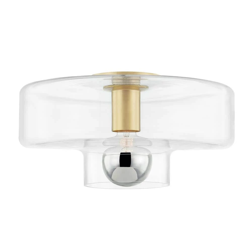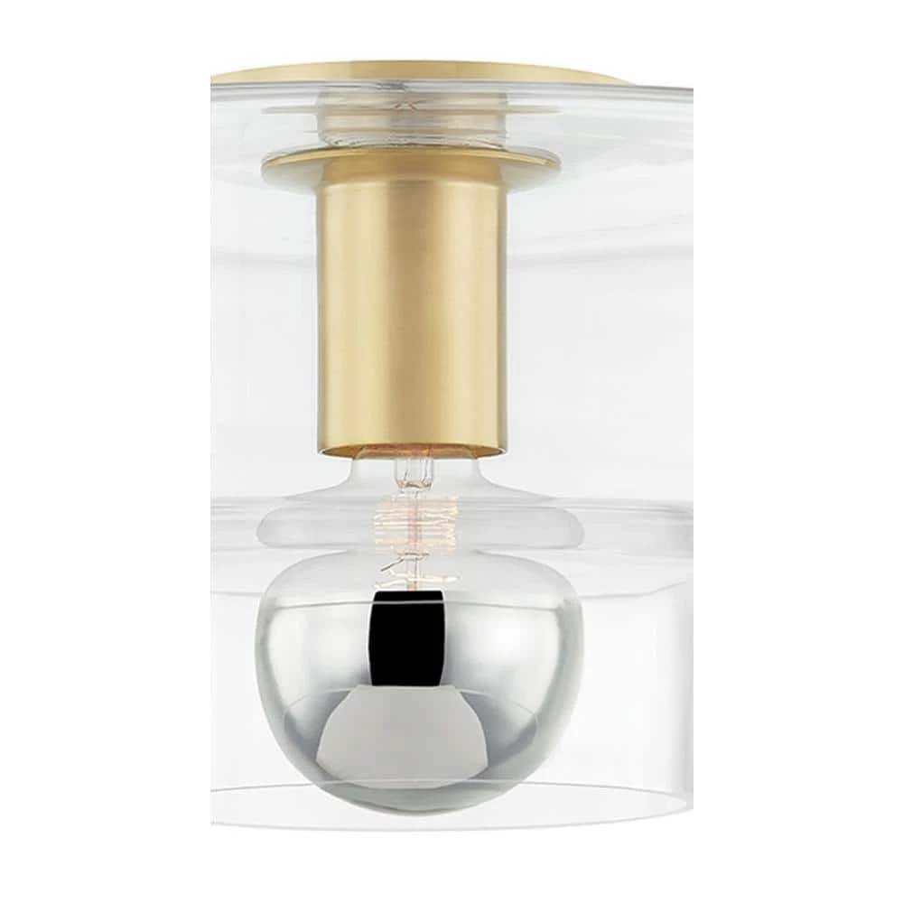 Everyone deserves to enjoy the benefits of good design in their home-and now everyone can. Not your grandmother’s mushroom-shaped flush mount, Iona’s clear glass drum shade quite literally captures the glow of the globe bulb inside. The clean, smooth design is available in Aged Brass or Polished Nickel with an incandescent or silver-tipped bulb.