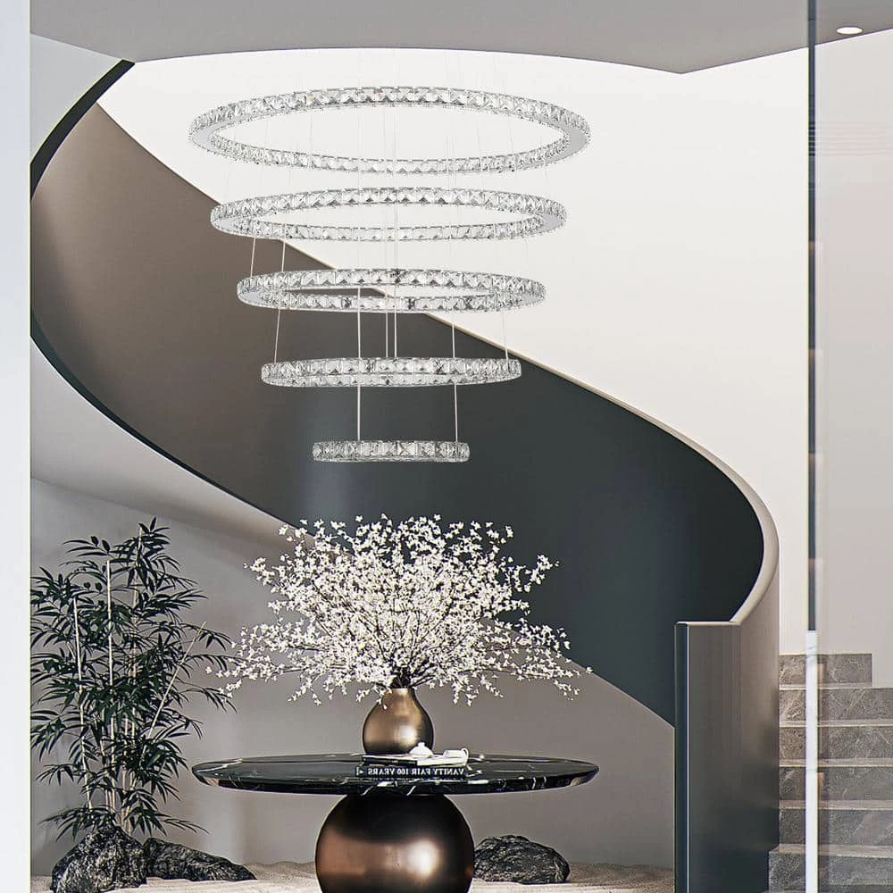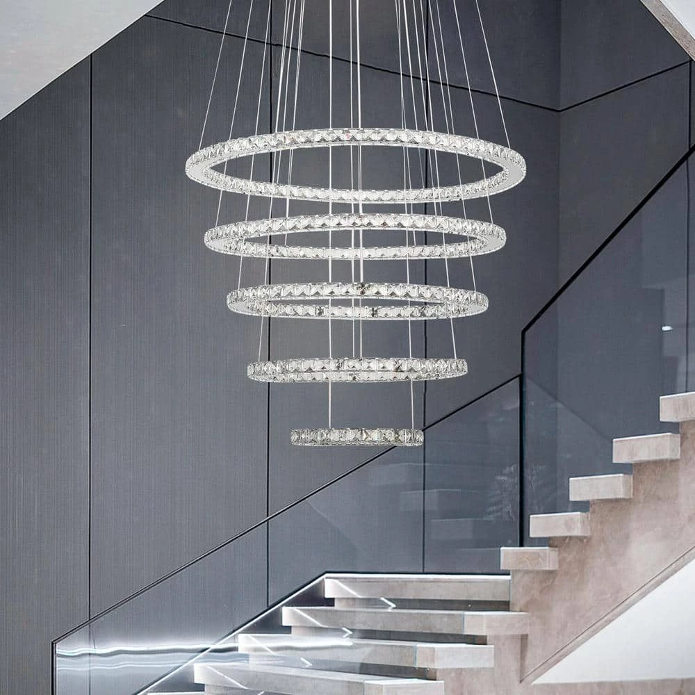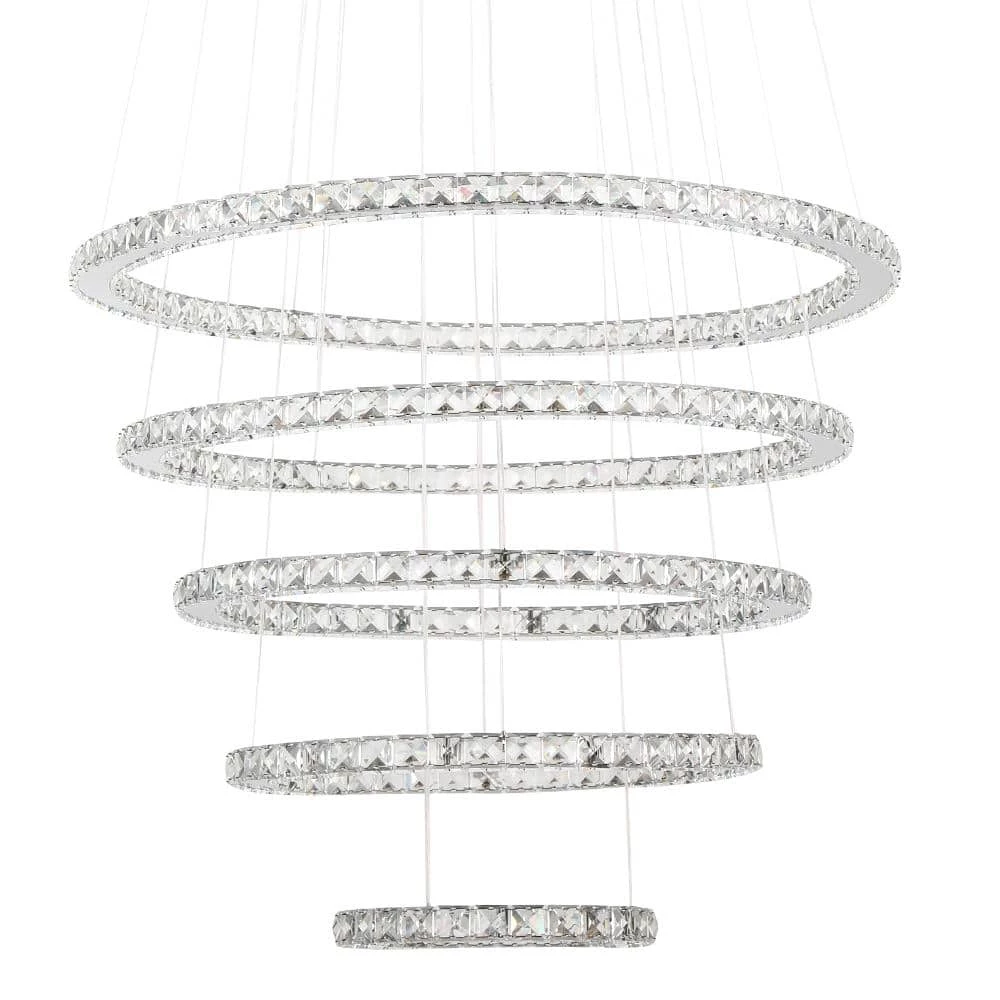 Make a bold and glamorous statement above your kitchen island or dining table with this chandelier. It features 5 tiers of circles that are suspended by wires and are lined with royal cut crystals. You can adjust the wires to create a simple stacked silhouette or a collapsed geometric look. Within each circle are integrated LED lights that cast a bright glow in your home. This fixture is compatible with a dimmer switch, so you’ll always have the right amount of light.