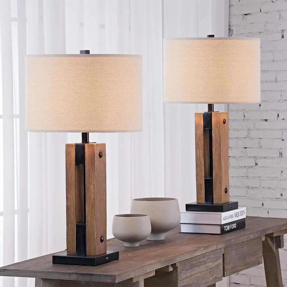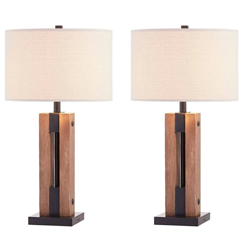 - Bring rustic style to your living room, bedroom or home office with this 28 in. lamps, we love that each lamp has a USB port on its base, so you can keep your favorite devices charged, each lamp is made of resin, with a black square base and a rectangular body in a woodgrain finish, offering distinctive contrast, it has a simple 15 in. Dia drum shade made of oatmeal fabric
