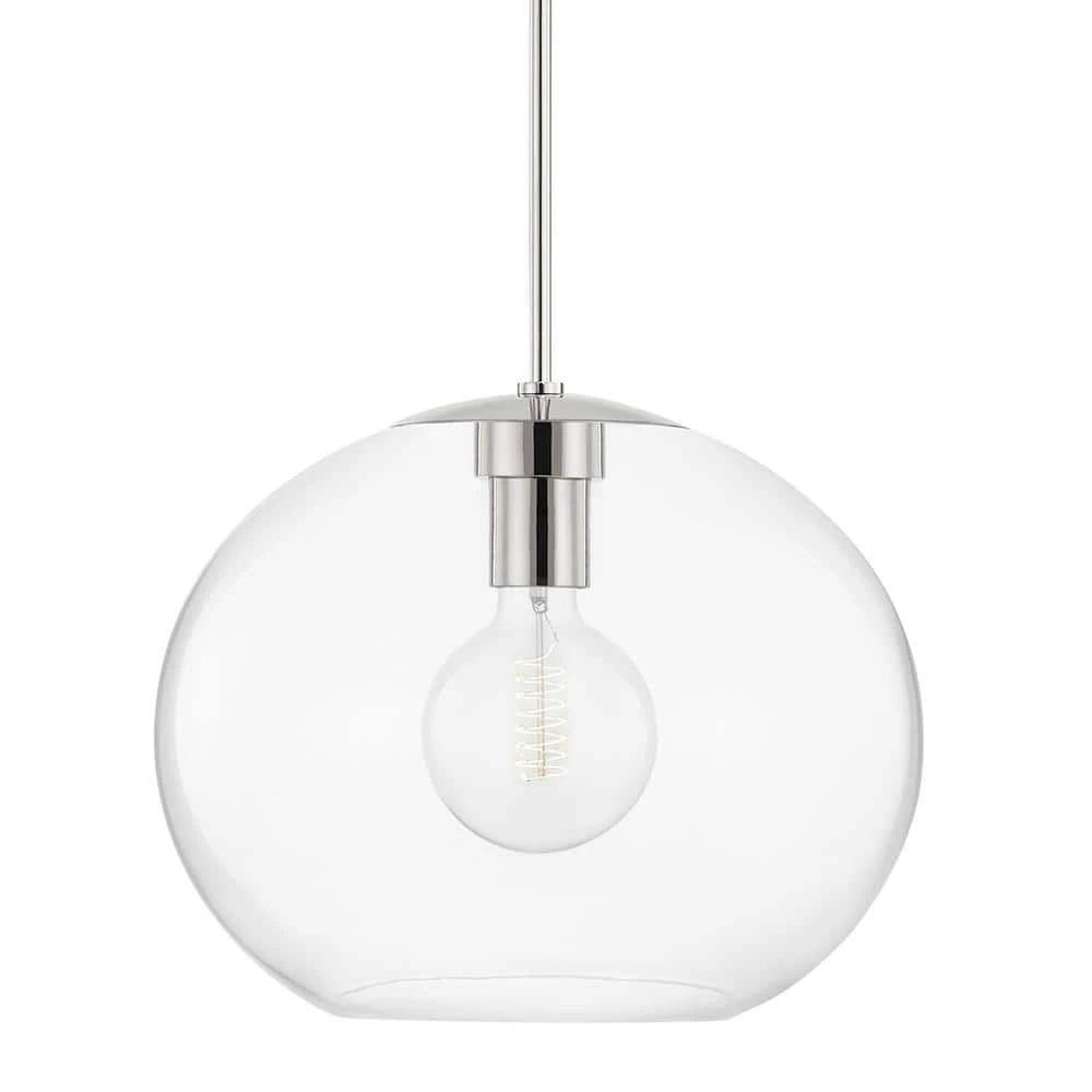A single incandescent bulb inside a clear glass shade gives off a calming vibe. Metal accents at the socket, shade cap and arm add to the pendant’s soothing effect. The open bottom and clear glass of the shade allow maximum light to flow both through and underneath, making this fixture an ideal choice anywhere bright light is needed.