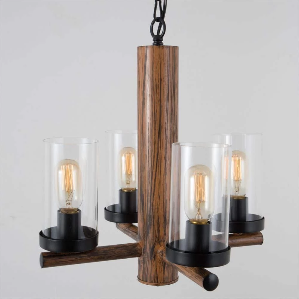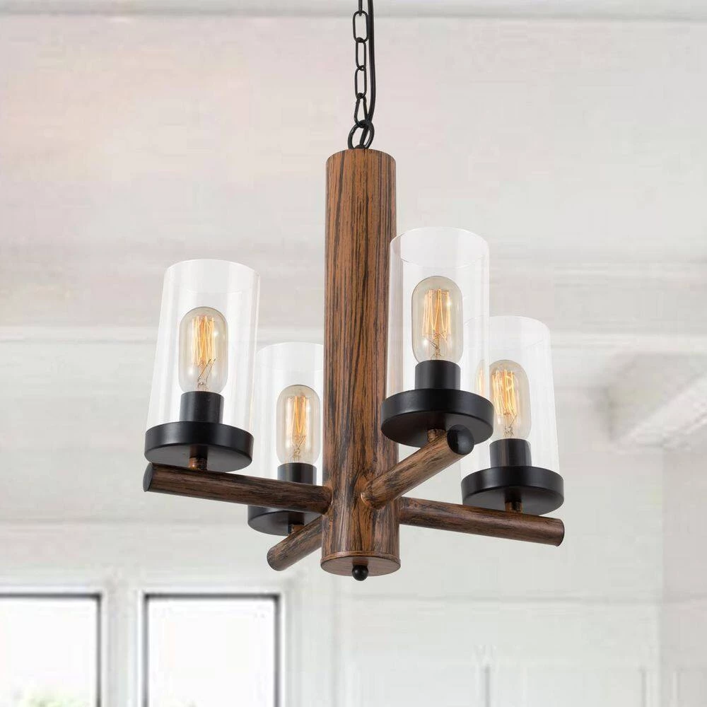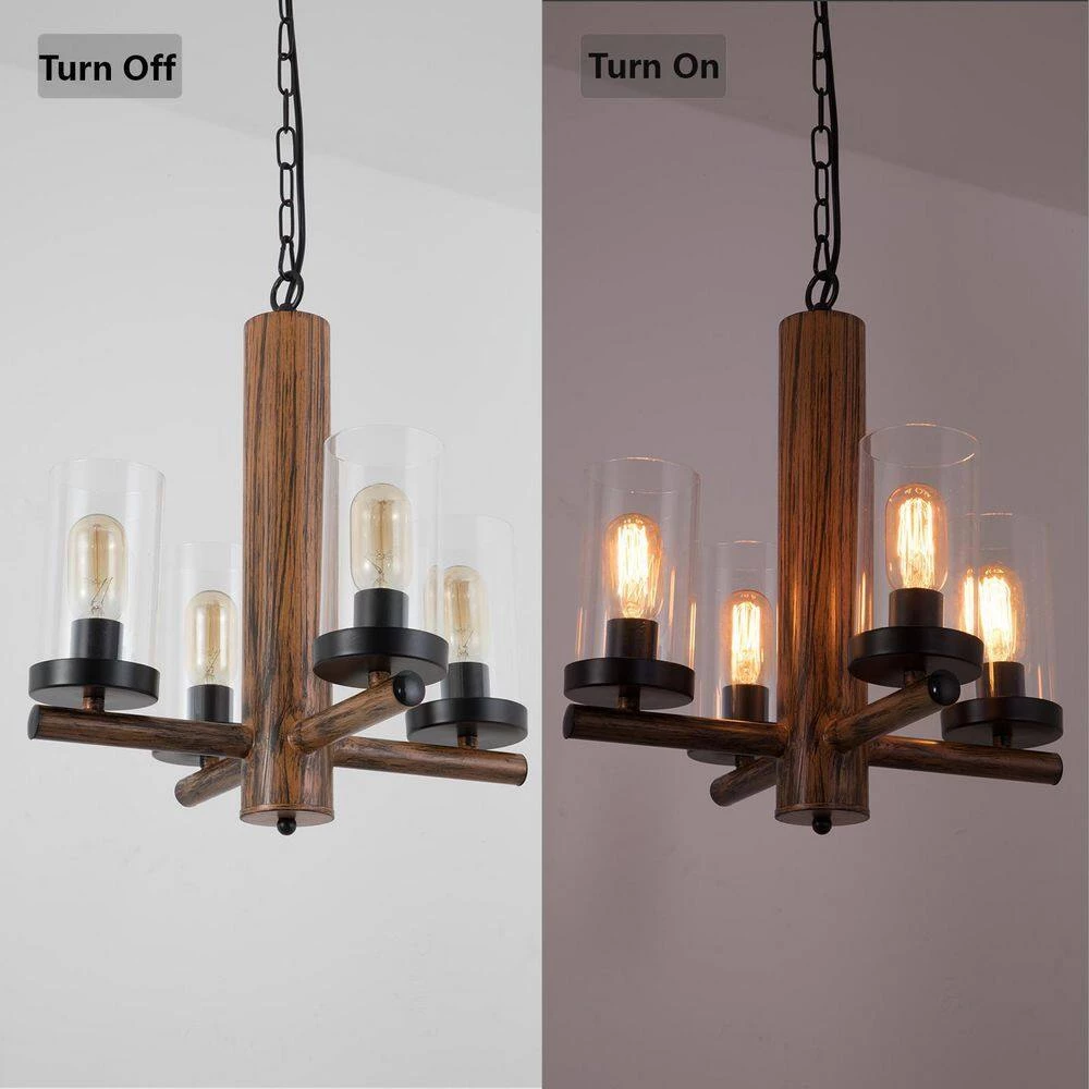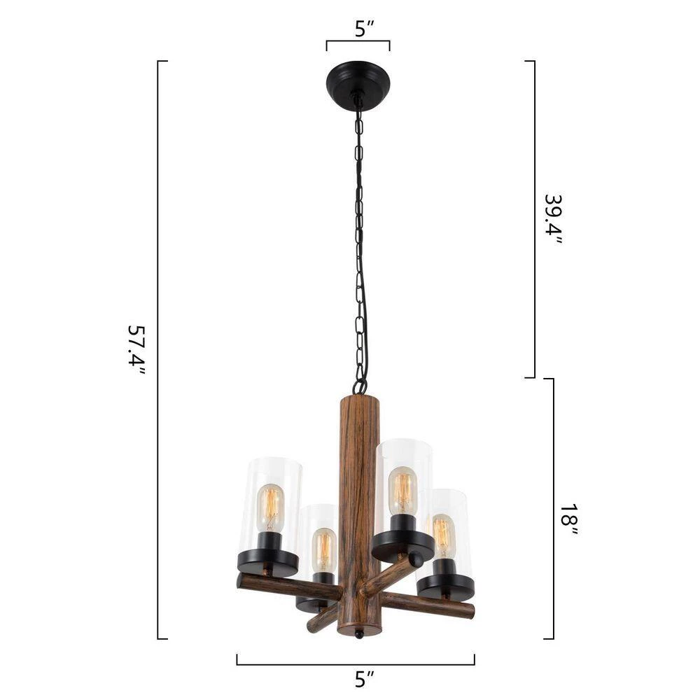 This rustic farmhouse-style chandelier is made of metal and its faux wood feel adds a retro, artistic and glamorous appeal. Easy to clean also ensures years of reliable performance. The 4 E26 base bulbs emit soft light from the clear glass shade, making you feel the warmth of home. Adjustable hanging chain, suitable for any space in your home, it will be a beautiful, eye-catching decoration on your kitchen island or dining room. (Bulb sold separately).