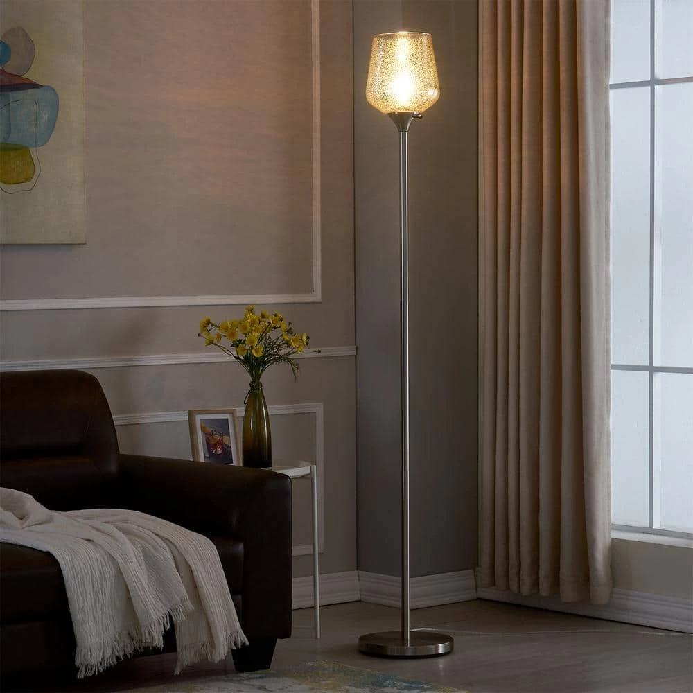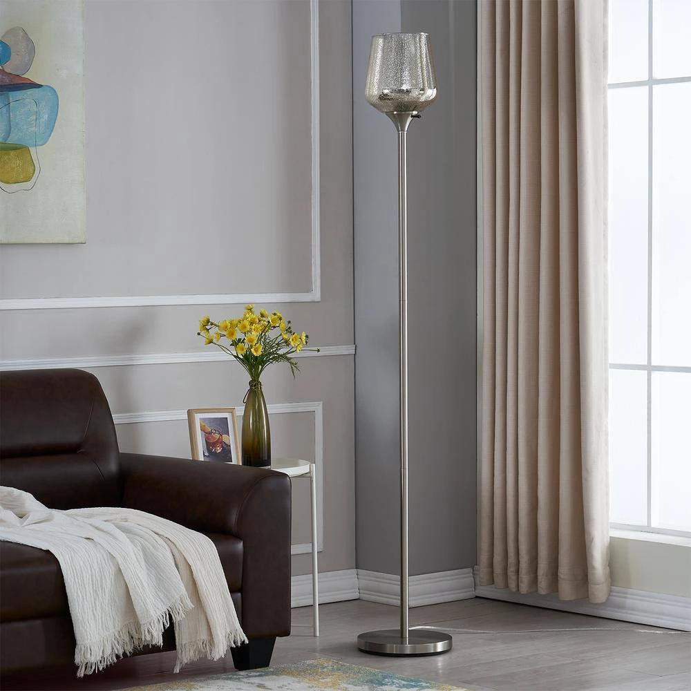 Light your home in style with this sleek and sophisticated 70 in. floor lamp. A perfect pick for contemporary and modern ensembles, it showcases a slim profile and a torchiere design. The round base and stand are crafted from metallic nickel finish. Up top, you’ll find a single light, highlighted elegantly with mercury glass torchiere shade which directs light upward with a warm glow.