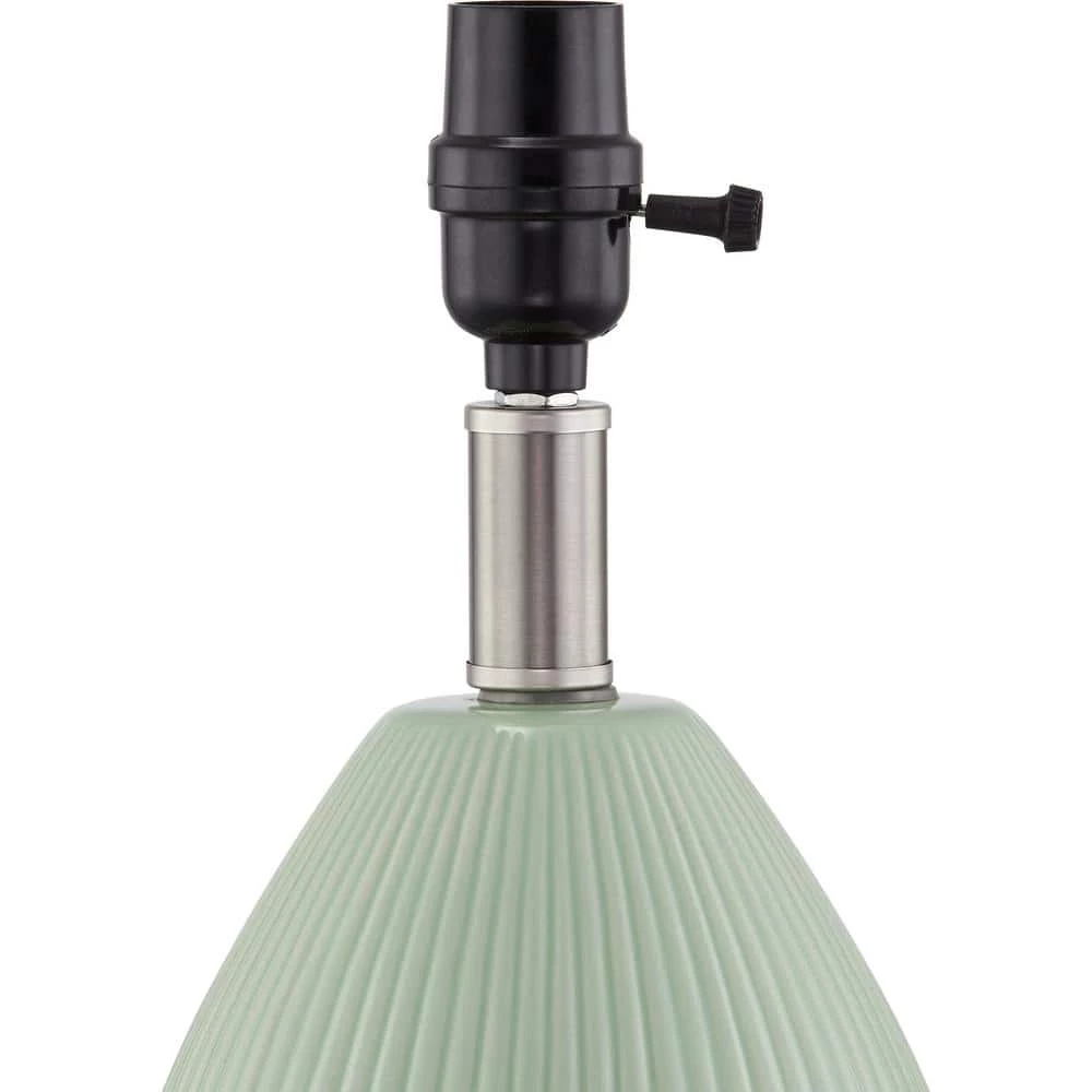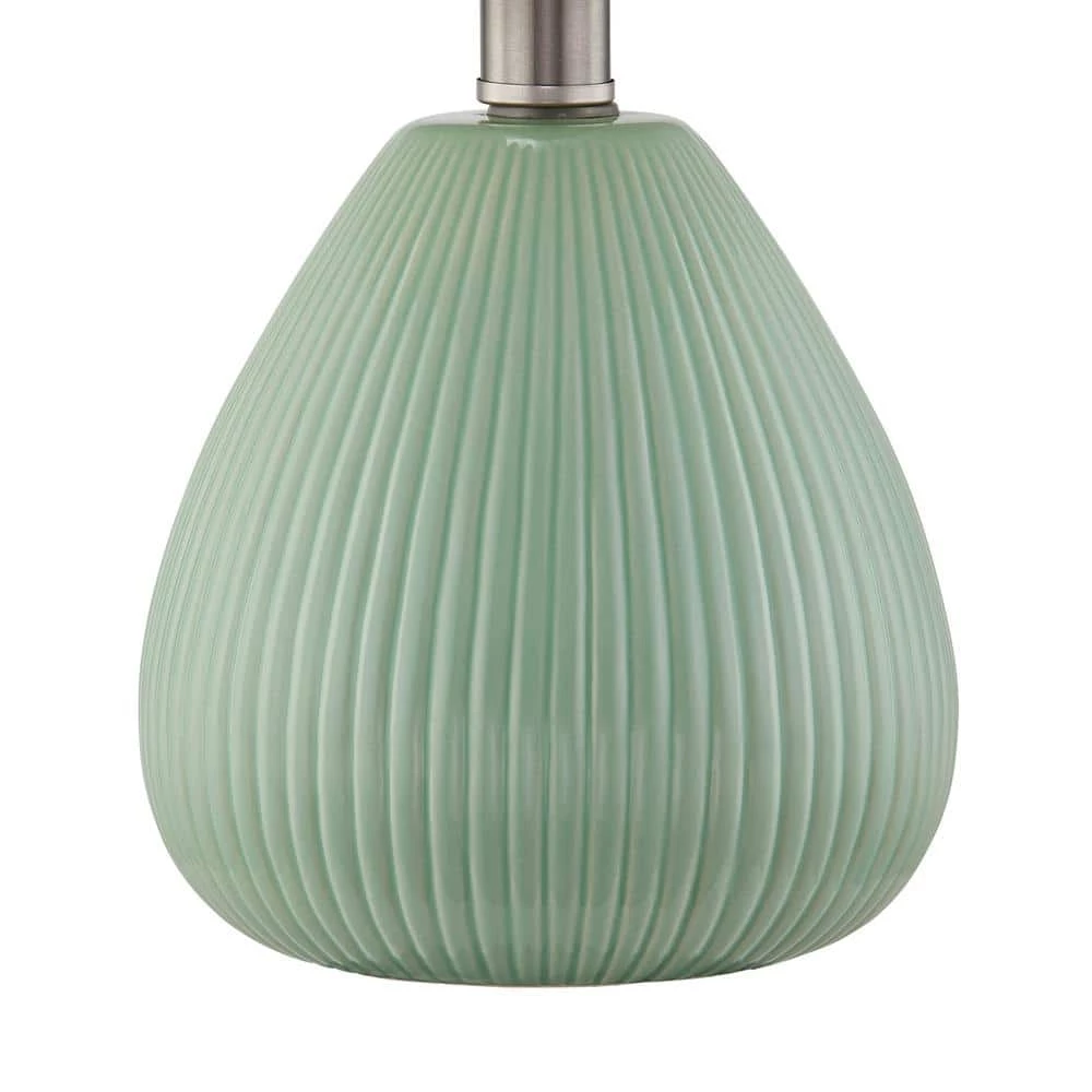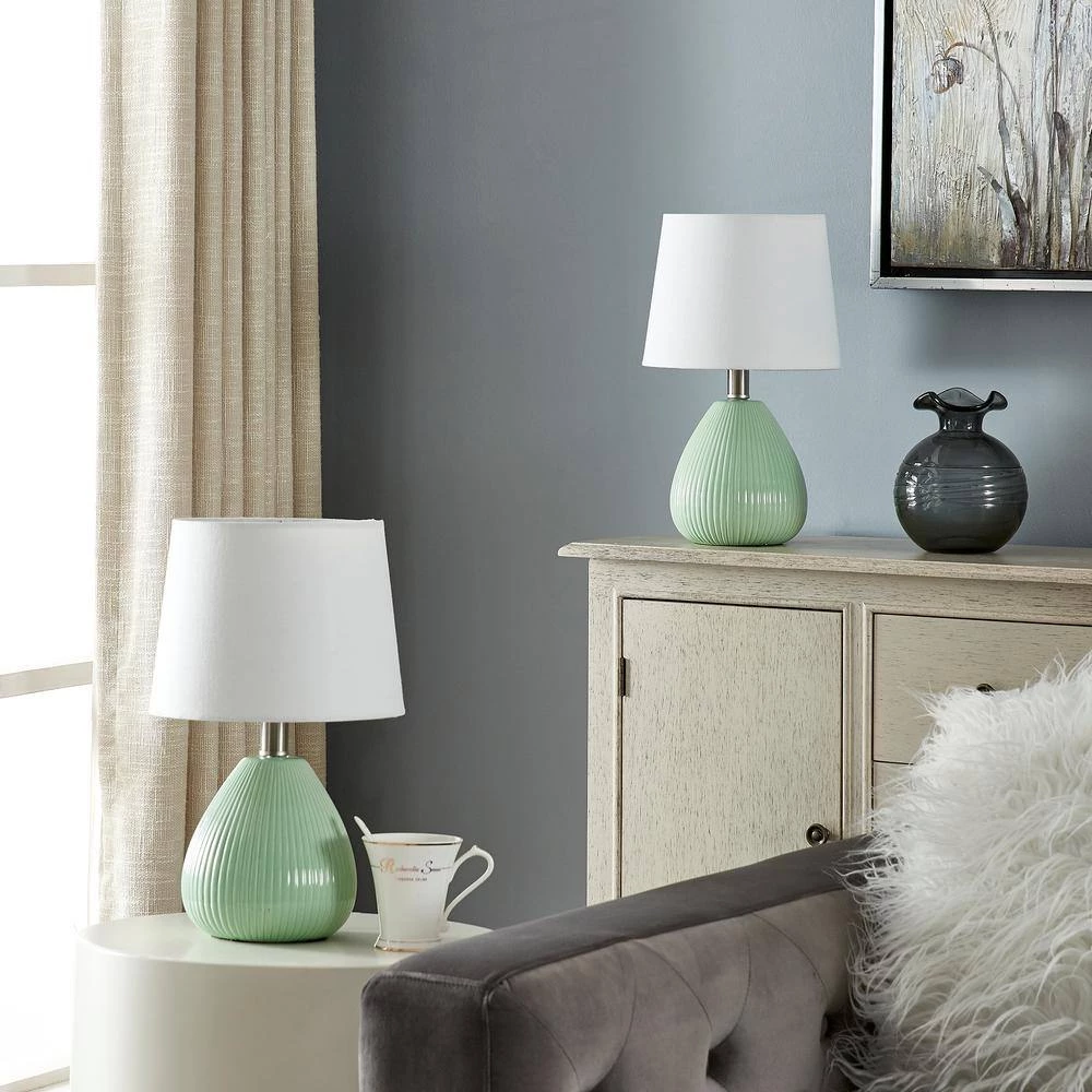 Bring sleek style to your living room, bedroom or home office with this set of 2 simple ceramic table lamps. Each lamp features a teardrop-shaped base with a distinctive ribbed texture and a slim metal neck with a rotary switch. The 9 in. H empire shade is made of ivory linen fabric, creating an ambient glow. We love that this set can be used separately or together on a set of nightstands or end tables. These lamps complete the look in any mid-century modern or bohemian setting.