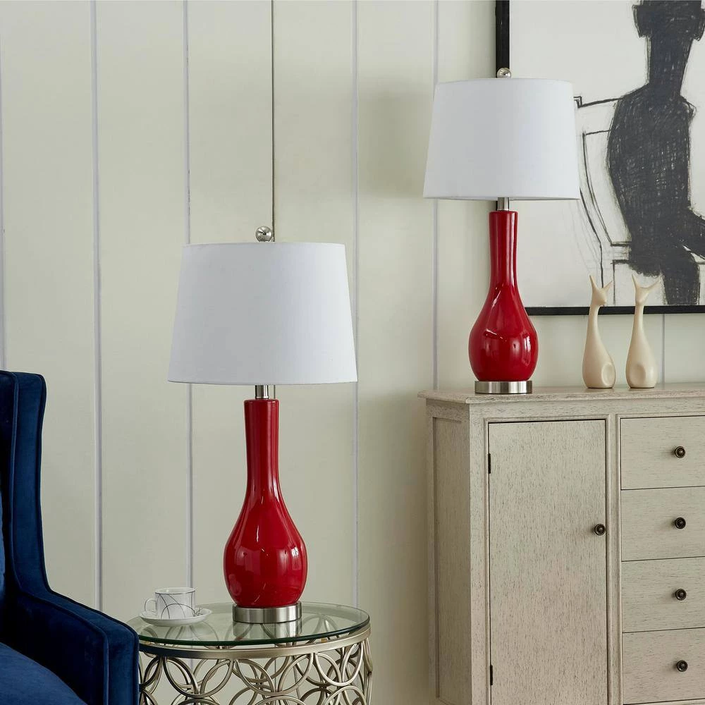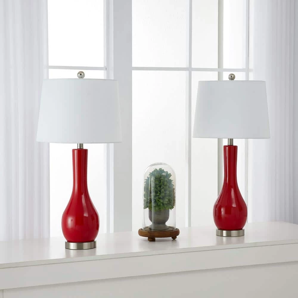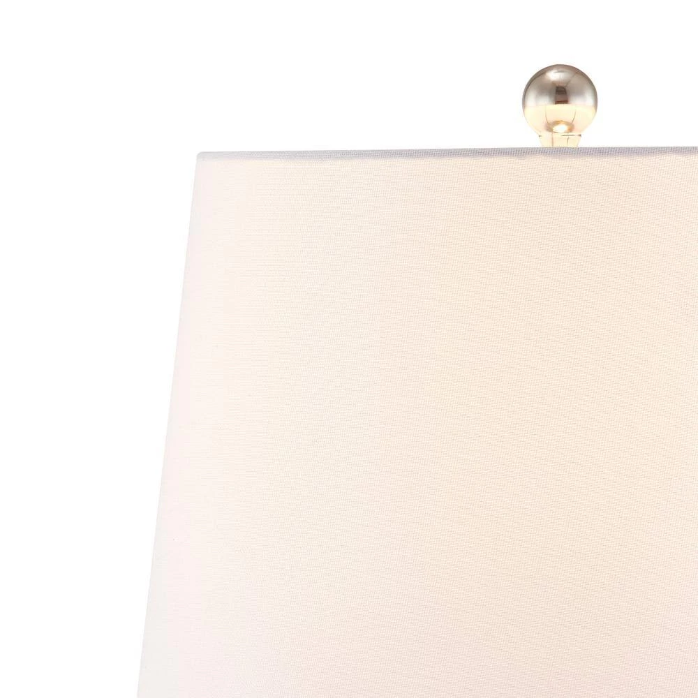 Turn on the charm in any space with this set of two classic table lamps. Each of these ceramic lamps features a circular silver-toned metal base, a teardrop-shaped bottom, and a slim neck. The white flared linen shade on each lamp is topped by a round, silver-toned finial. Each of these lamps has a three-way rotary socket switch and a USB port to keep your favorite devices charged. This set completes the look in any traditional space.