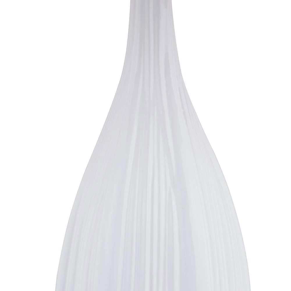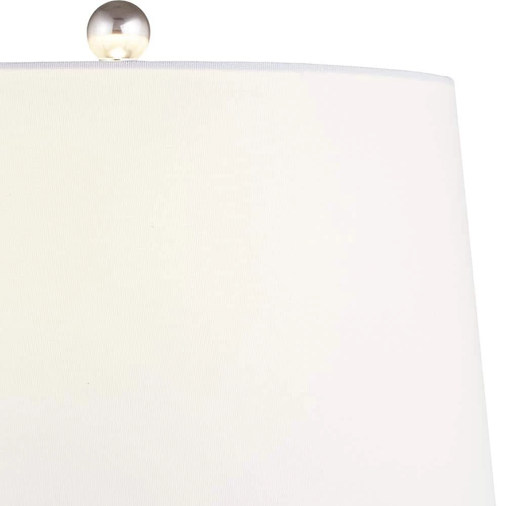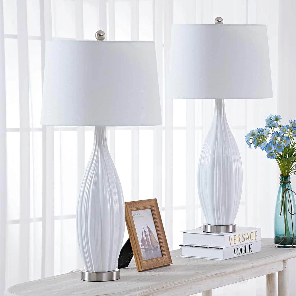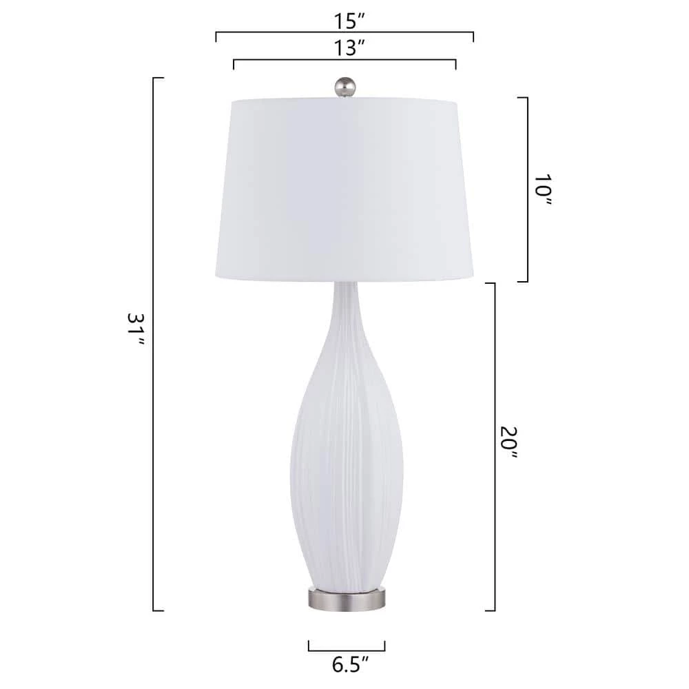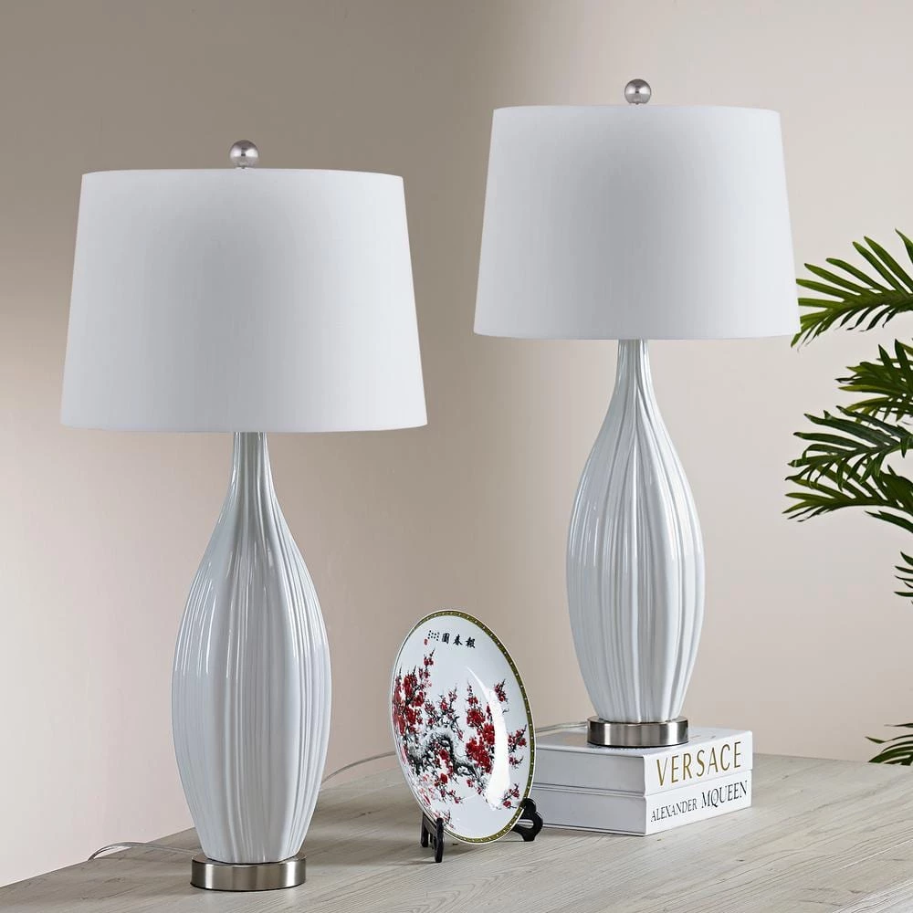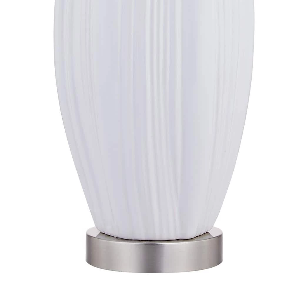 This 2-piece pair of table lamps add a sleek, sophisticated vibe to any space. Each lamp is made from white porcelain and sits on a metal base with a sleek silver finish. We love the way the pearlescent finish complements the elegantly tapered silhouette which is textured with vertical grooves for added visual intrigue. Up top, each lamp features a white empire shade which houses a 100-Watt bulb (sold separately) that is easy to operate thanks to the built-in rotary socket. These lamps each measure 31 in. tall.