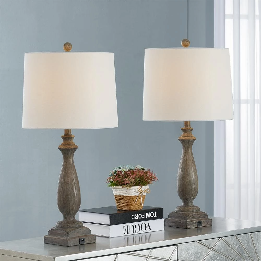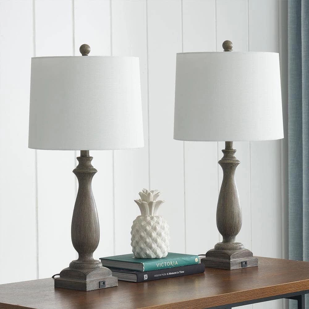 Lightweight, portable, and mindful of space, table lamps keep your home looking on the bright side with just-right task and accent lighting. Arriving in a set of 2, the minimal aesthetic of its beautifully turned body, crafted with a gray finish, is enhanced by its crisp cotton blend shade. Let it top your living room end tables to tie together a traditional seating group, or add it to your nightstands to build a beautiful bedside vignette. Each fixture accommodates 1 medium-base incandescent lightbulb of up to 100-Watt (bulbs not included) and uses an on/off switch type.